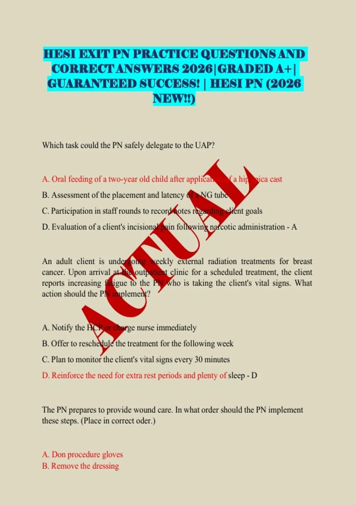 HESI EXIT PN PRACTICE QUESTIONS AND CORRECT ANSWERS 2026|GRADED A+| GUARANTEED SUCCESS! | HESI PN (2026 NEW!!)