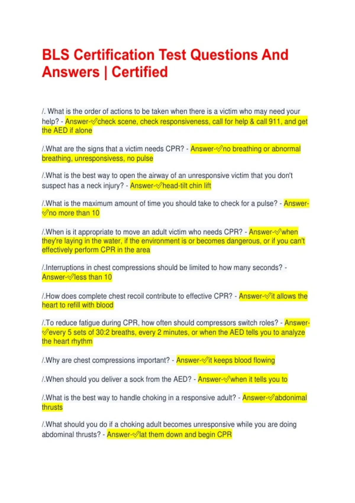 BLS Certification Test Questions And Answers | Certified /. What is the order of actions to be taken when there is a victim who may need your help? - Answer-check scene, check responsiveness, call for help & call 911, and get the AED if alone /.What are the signs that a victim needs CPR? - Answer-no breathing or abnormal breathing, unresponsivess, no pulse /.What is the best way to open the airway of an unresponsive victim that you don't suspect has a neck injury? - Answer-head-tilt chin lift /.What is the maximum amount of time you should take to check for a pulse? - Answer-no more than 10 /.When is it appropriate to move an adult victim who needs CPR? - Answer-when they're laying in the water, if the environment is or becomes dangerous, or if you can't effectively perform CPR in the area /.Interruptions in chest compressions should be limited to how many seconds? - Answer-less than 10 /.How does complete chest recoil contribute to effective CPR? - Answer-it allows the heart to refill with blood /.To reduce fatigue during CPR, how often should compressors switch roles? - Answer-every 5 sets of 30:2 breaths, every 2 minutes, or when the AED tells you to analyze the heart rhythm /.Why are chest compressions important? - Answer-it keeps blood flowing /.When should you deliver a sock from the AED? - Answer-when it tells you to /.What is the best way to handle choking in a responsive adult? - Answer-abdonimal thrusts /.What should you do if a choking adult becomes unresponsive while you are doing abdominal thrusts? - Answer-lat them down and begin CPR