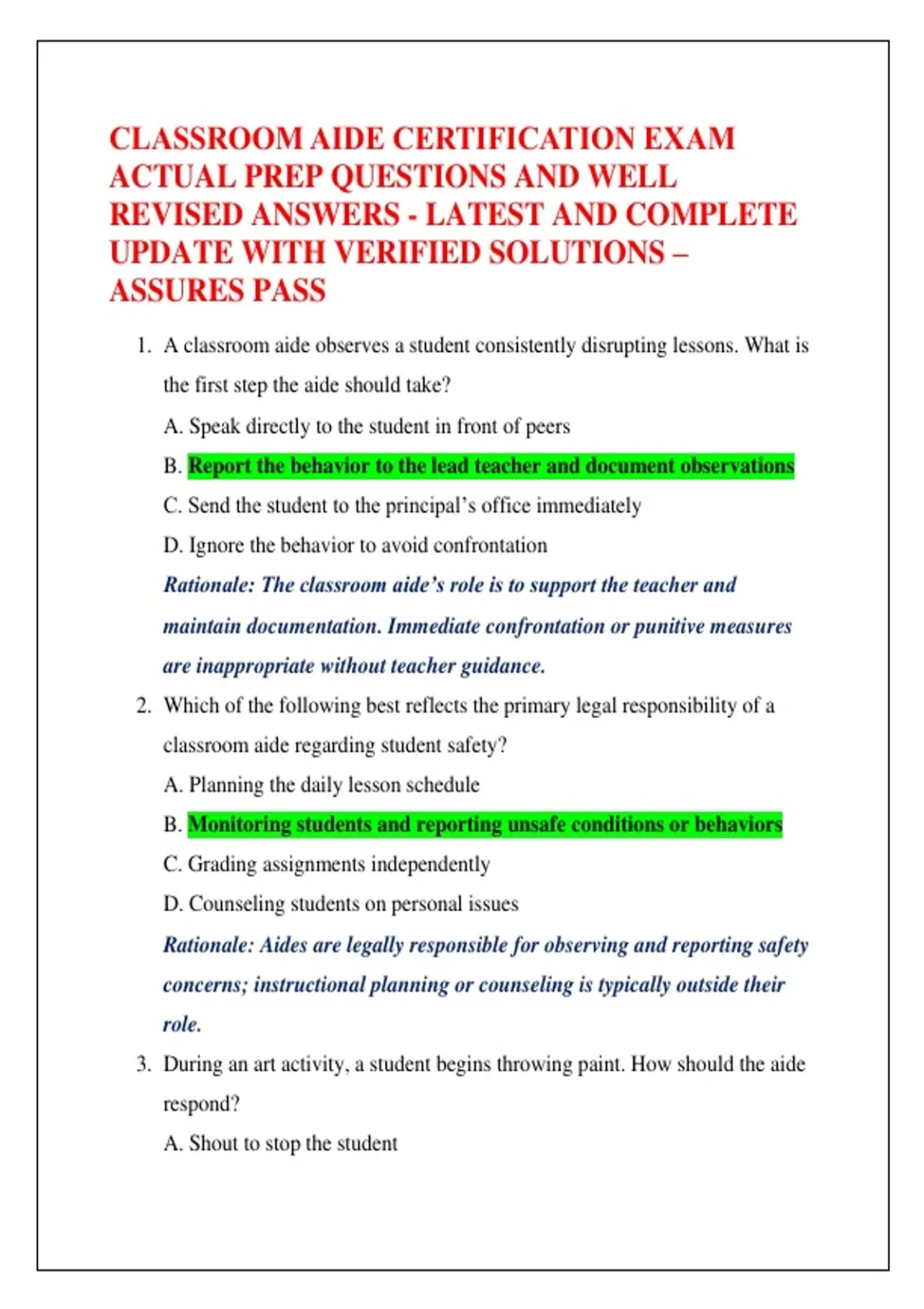 CLASSROOM AIDE CERTIFICATION EXAM ACTUAL PREP QUESTIONS AND WELL REVISED ANSWERS - LATEST AND COMPLETE UPDATE WITH VERIFIED SOLUTIONS – ASSURES PASS