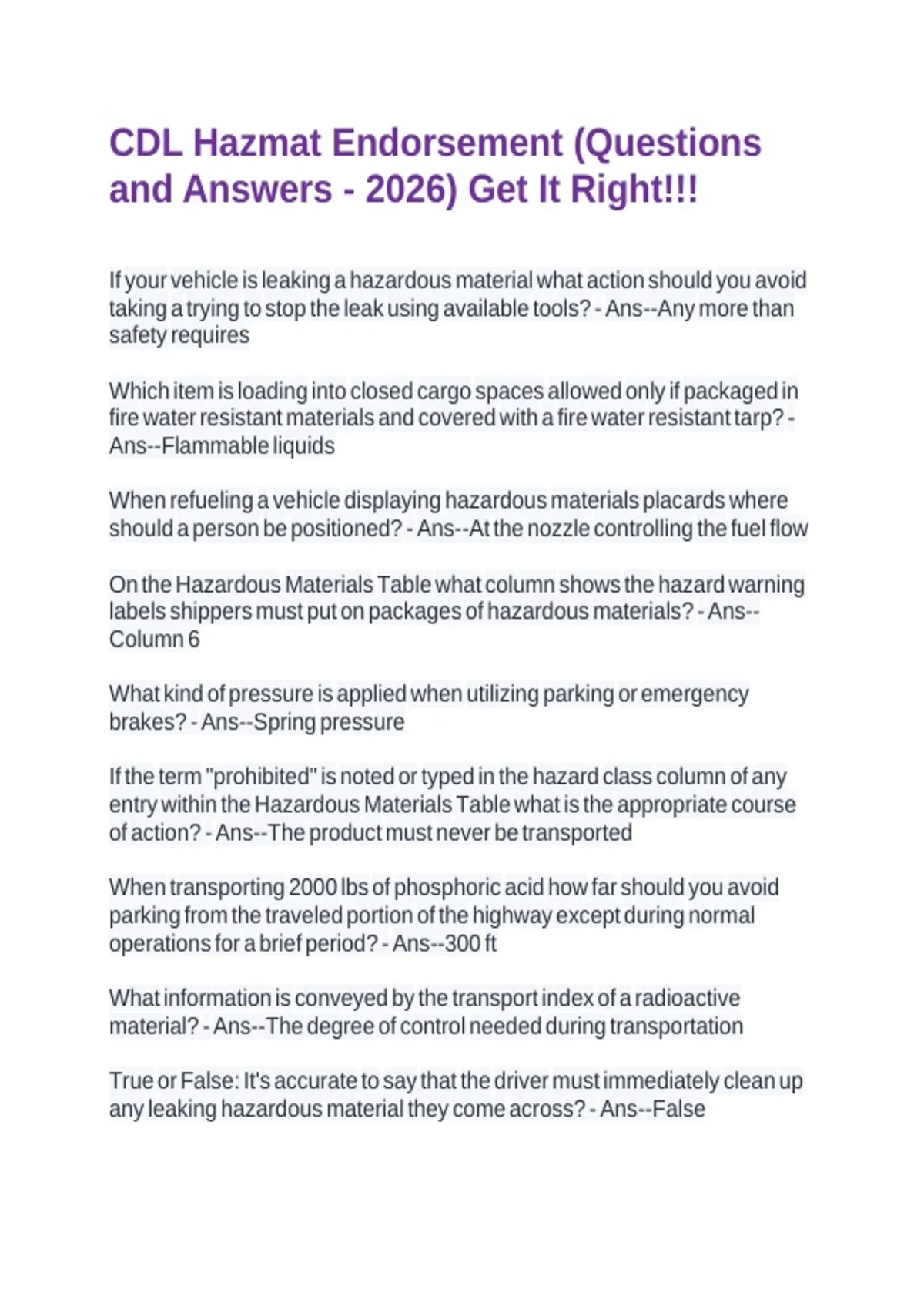 CDL Hazmat Endorsement (Questions and Answers - 2026) Get It Right!!!