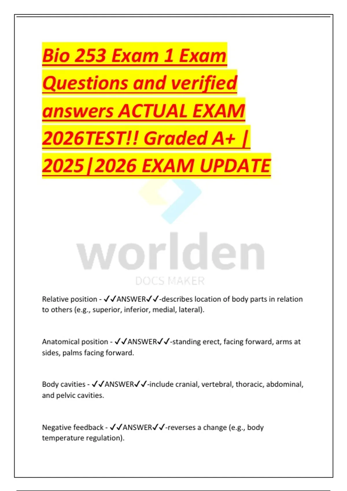 Bio 253 Exam 1 Exam Questions and verified answers ACTUAL EXAM 2026TEST!! Graded A+ | 2025|2026 EXAM UPDATE