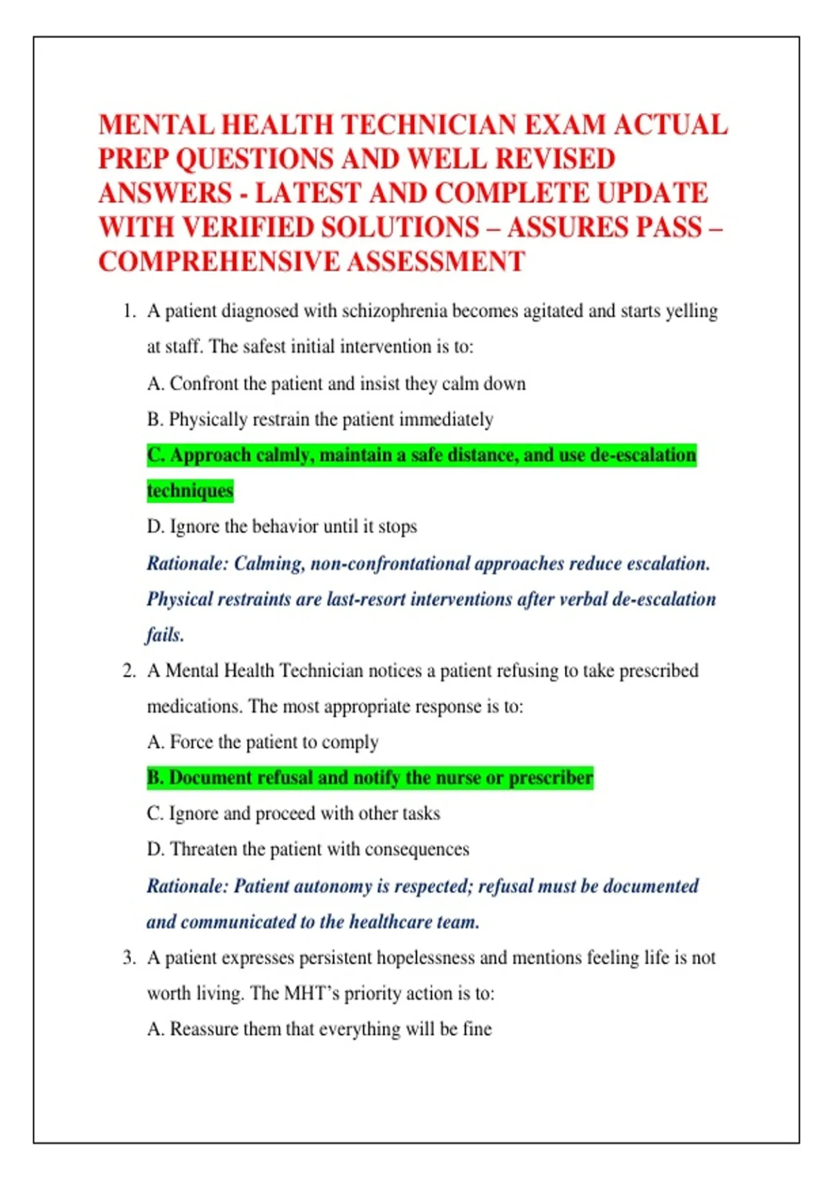 MENTAL HEALTH TECHNICIAN EXAM ACTUAL PREP QUESTIONS AND WELL REVISED ANSWERS - LATEST AND COMPLETE UPDATE WITH VERIFIED SOLUTIONS – ASSURES PASS – COMPREHENSIVE ASSESSMENT