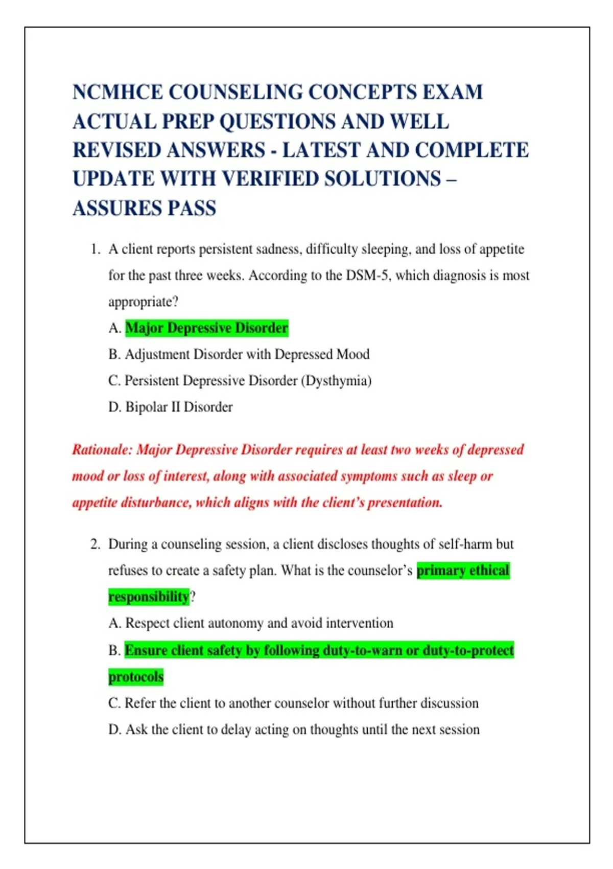 NCMHCE COUNSELING CONCEPTS EXAM ACTUAL PREP QUESTIONS AND WELL REVISED ANSWERS - LATEST AND COMPLETE UPDATE WITH VERIFIED SOLUTIONS – ASSURES PASS