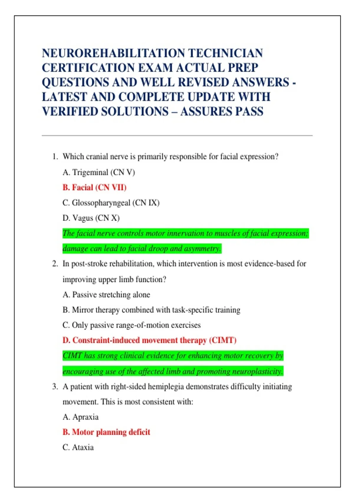NEUROREHABILITATION TECHNICIAN CERTIFICATION EXAM ACTUAL PREP QUESTIONS AND WELL REVISED ANSWERS - LATEST AND COMPLETE UPDATE WITH VERIFIED SOLUTIONS – ASSURES PASS