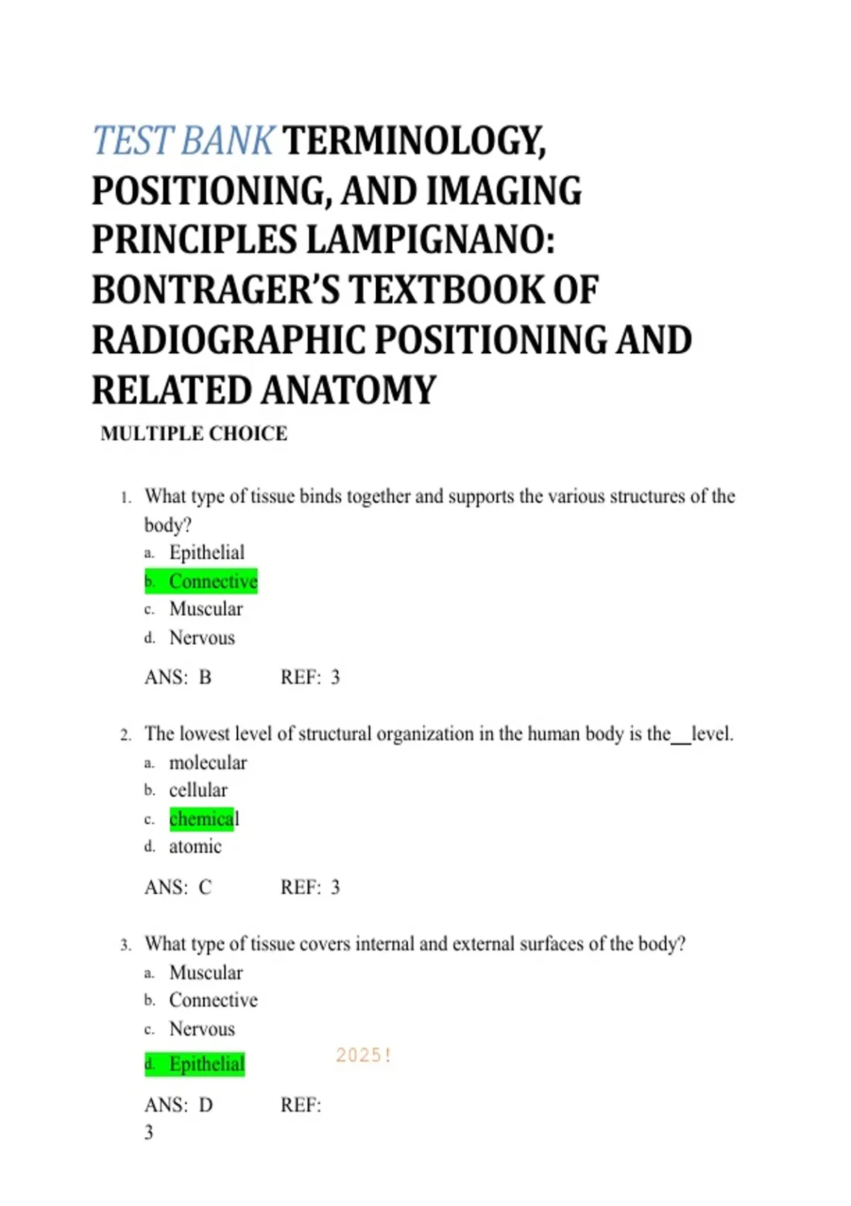 Official test bank for Bontrager’s Textbook of Radiographic Positioning and Related Anatomy by Lampignano. Covers terminology, positioning, and imaging principles with all chapters, 100% verified chapters, and a 2026 latest update.