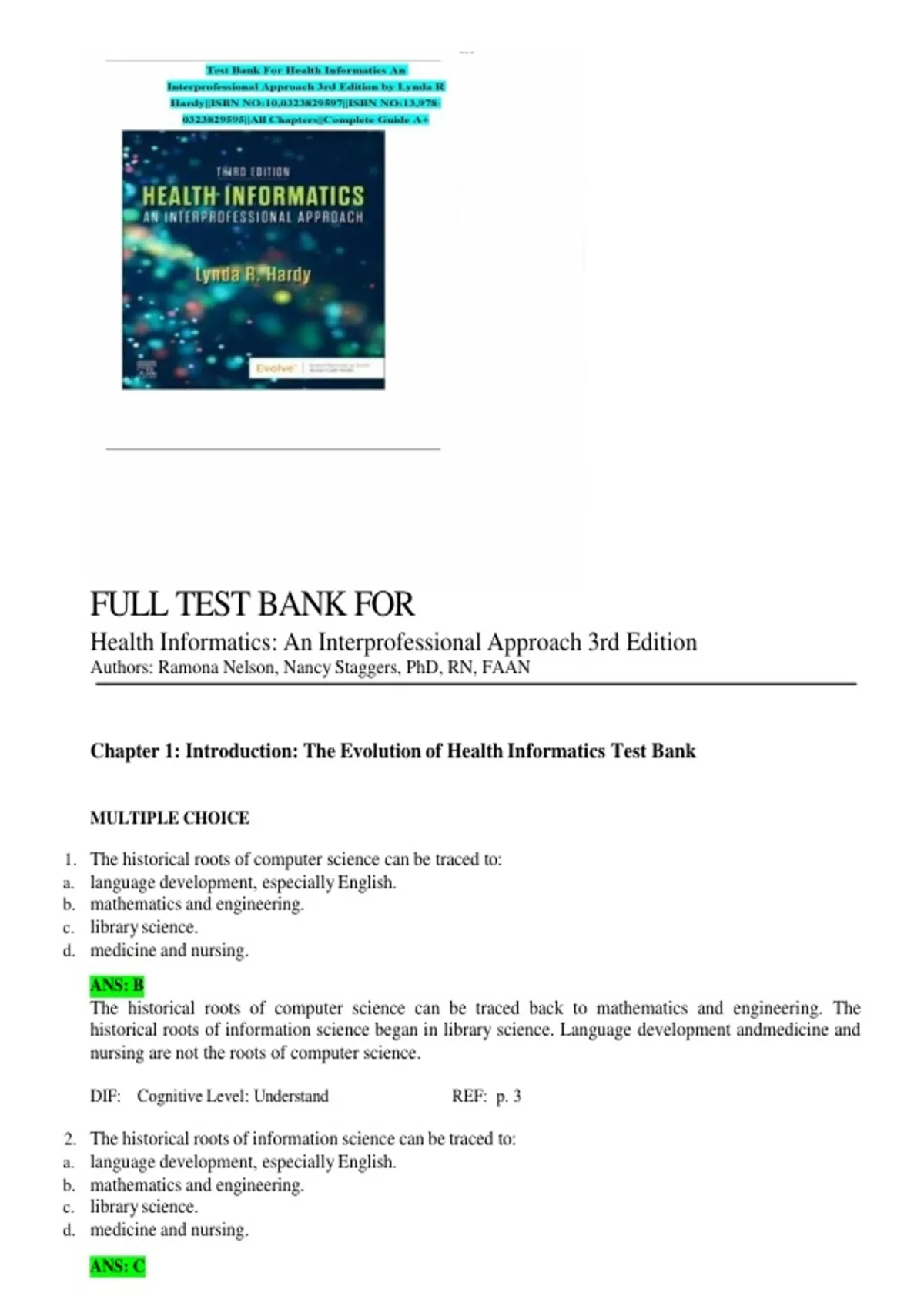 This document provides a complete test bank for Health Informatics: An Interprofessional Approach (3rd Edition) by Ramona Nelson and Nancy Staggers. It covers core topics such as healthcare information systems, clinical informatics, data management, interoperability, and interprofessional collaboration, making it suitable for exam preparation and study support.