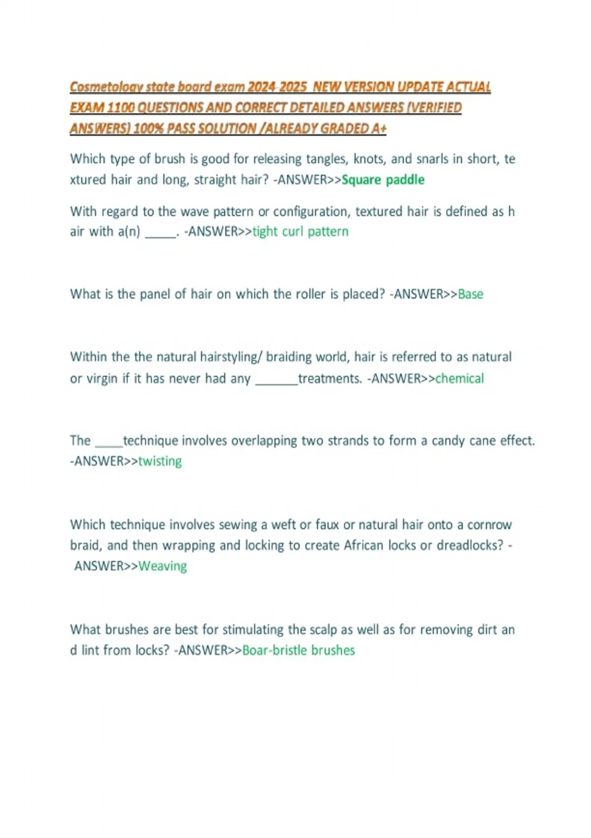 Prepare for your licensing with the Texas Cosmetology State Board Exam resource! This updated guide for 2025 includes 200 actual exam questions, each paired with correct and detailed answers. Specifically designed to help you succeed, this resource is essential for anyone looking to excel in the Texas cosmetology state board certification. What You Will Get: 200 complete and verified questions reflecting the latest Texas cosmetology exam format Detailed explanations for each answer to enhance your understanding of cosmetology concepts Effective strategies to optimize your exam preparation A reliable study tool tailored to support your journey toward licensure Ideal For: Cosmetology students preparing for the Texas State Board Exam Professionals seeking to refresh their knowledge in cosmetology practices Don’t miss this opportunity to enhance your exam readiness—secure your copy of the Texas Cosmetology State Board Exam resource today and take a confident step toward achieving your licensure!