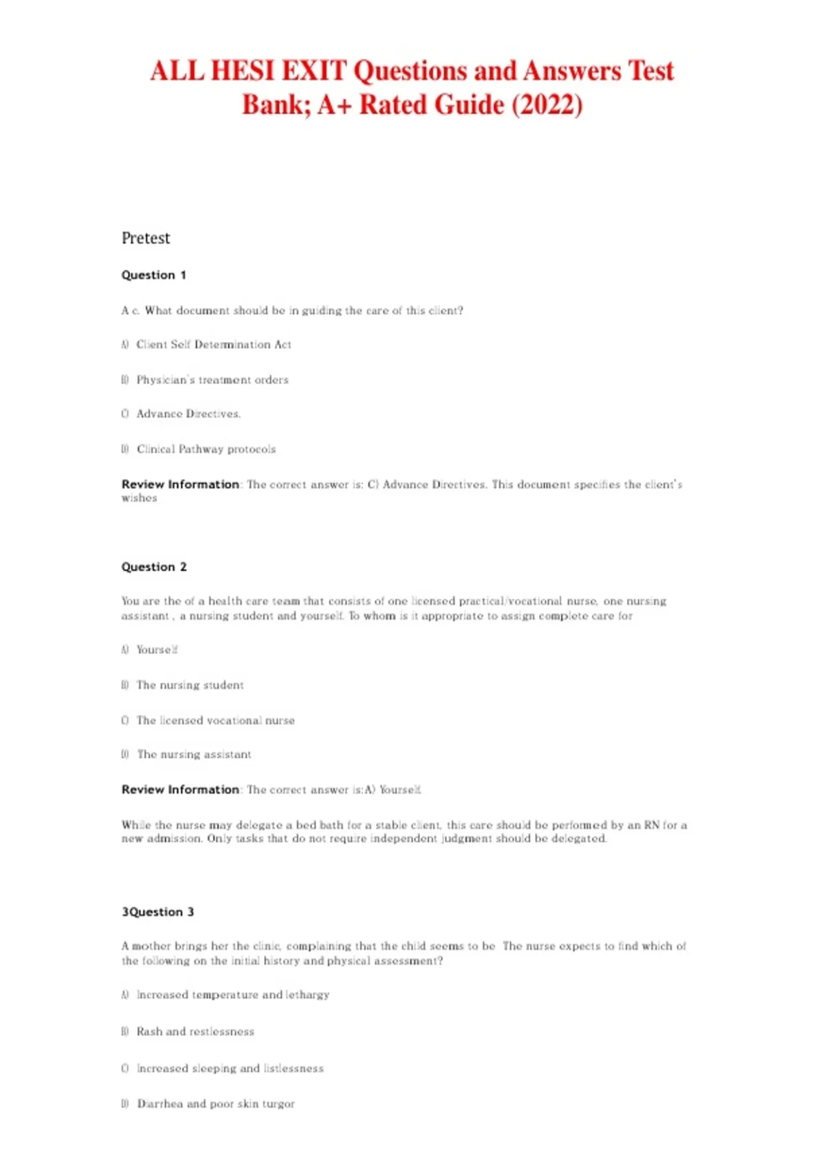 Review Information: The correct answer is: C) Advance Directives. This document specifies the client's