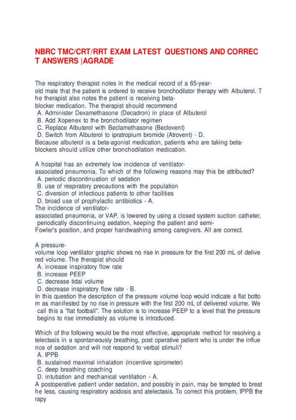 Prepare for your TMC NBRC certification with the TMC NBRC Actual Exam, Practice Exam, and Study Guide! This comprehensive resource for 2025 combines everything you need into one document, featuring 600 actual exam questions complete with correct and detailed answers. Designed to help you succeed, this all-in-one guide is essential for respiratory therapy students and professionals. What You Will Get: 600 complete and verified questions reflecting the latest TMC NBRC exam format Detailed explanations for each answer to enhance your understanding of respiratory care principles Realistic practice exams to simulate the testing experience Effective strategies to optimize your preparation and boost your confidence Ideal For: TMC candidates preparing for the NBRC certification exam Respiratory therapy students looking to reinforce their knowledge and skills Don’t miss this opportunity to enhance your exam readiness—secure your copy of the TMC NBRC Actual Exam, Practice Exam, and Study Guide today and take a confident step toward achieving your certification!