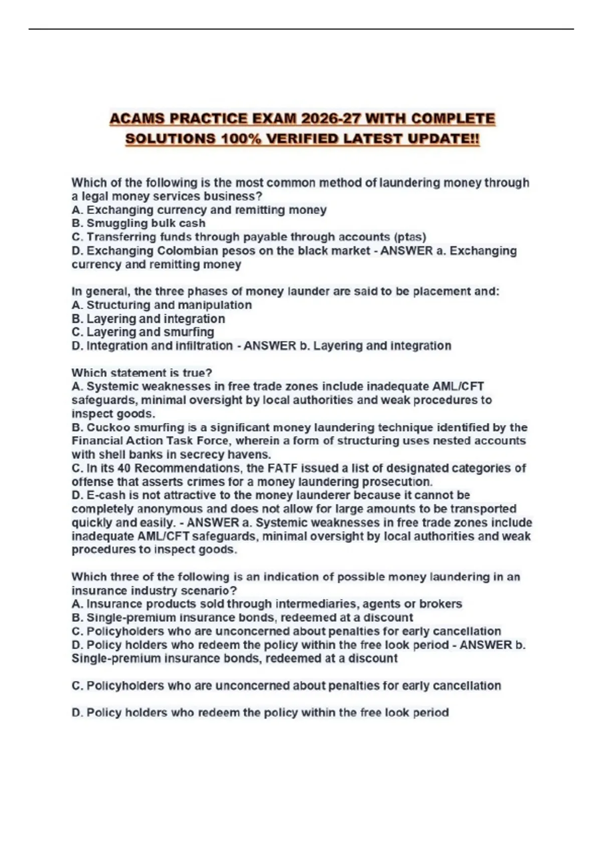 ACAMS PRACTICE EXAM 2026-27 WITH COMPLETE SOLUTIONS 100% VERIFIED LATEST UPDATE!!...