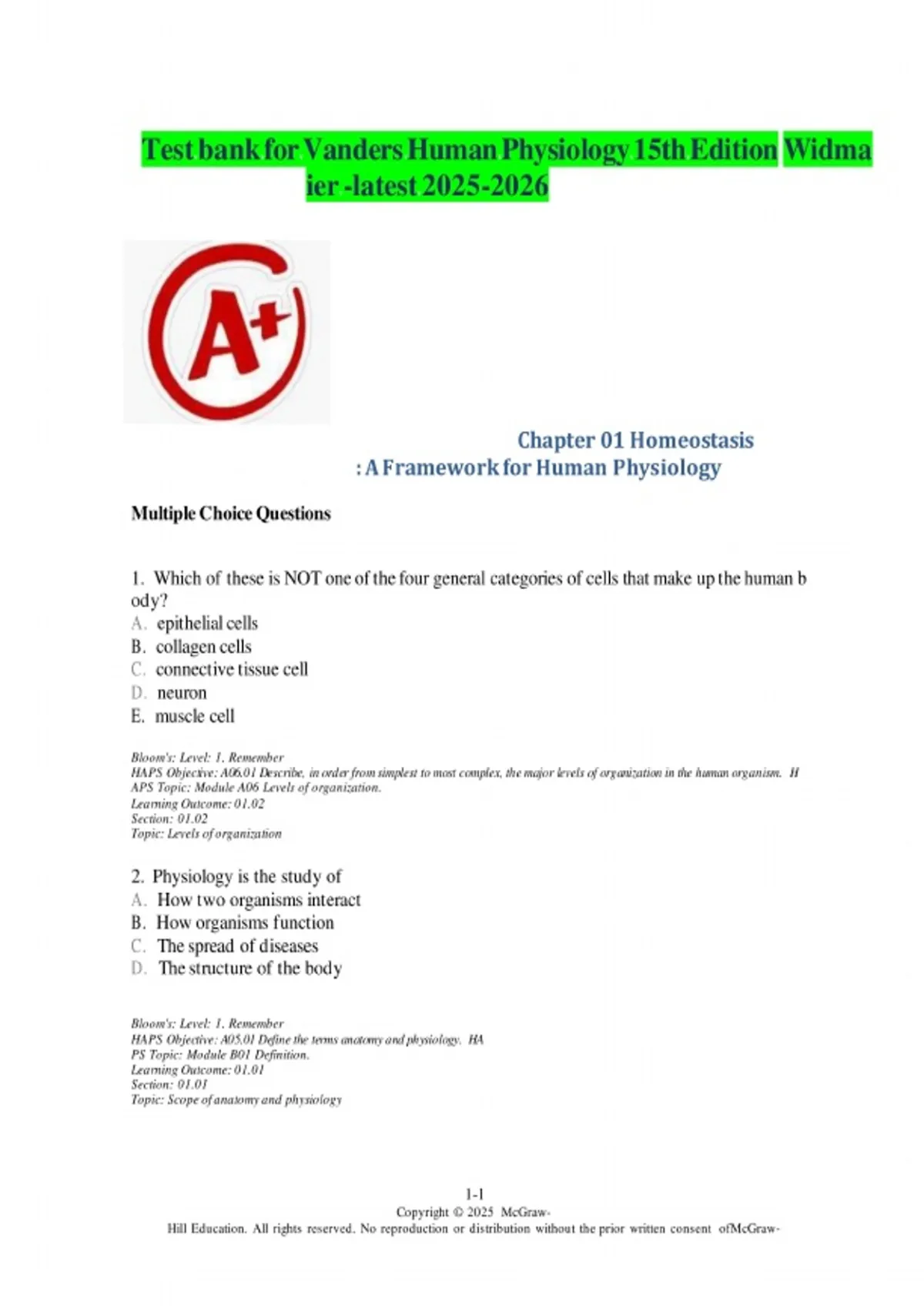 Enhance your understanding of human physiology with the Test Bank for Vander's Human Physiology, 15th Edition by Widmaier! This comprehensive resource includes a diverse array of questions designed to reinforce key concepts and theories in human physiology. Ideal for both students and educators, this test bank is an invaluable tool for mastering the material. What You Will Get: A complete set of exam questions aligned with the content of the 15th edition Varied question types to challenge your knowledge and application of physiological concepts Detailed explanations to deepen your comprehension of critical topics A reliable resource that supports academic success in physiology education Ideal For: Students studying human physiology or related fields Instructors seeking supplementary material for their courses Don’t miss the opportunity to boost your academic performance—secure your copy of the Test Bank for Vander's Human Physiology, 15th Edition today and take a significant step toward mastering your studies!