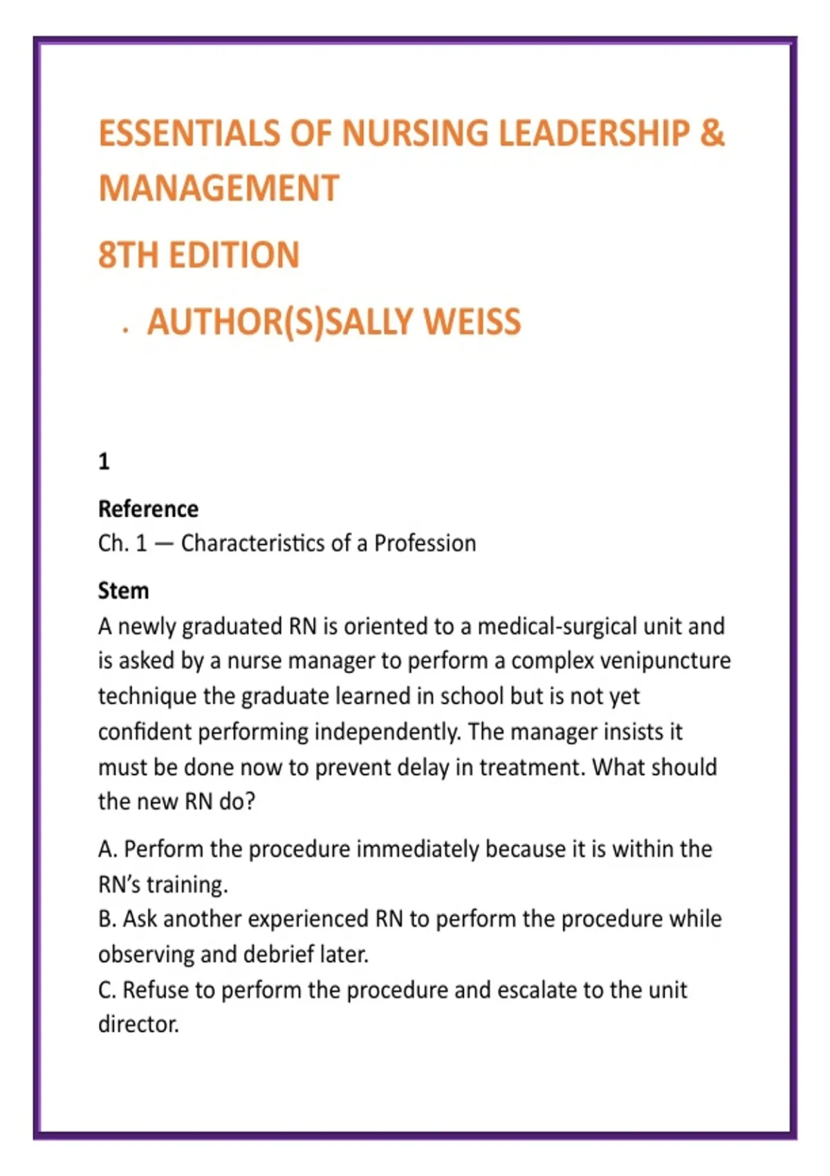 Essentials of Nursing Leadership & Management Weiss 8e Test Bank – Delegation & Prioritization MCQs, Nurse Leadership Exam Guide 2) SEO Product Description (200–300 words) Master the leadership, management, and professional practice skills every nurse is expected to demonstrate with this comprehensive Nursing Leadership & Management Test Bank built around Essentials of Nursing Leadership & Management, 8th Edition by Sally Weiss. This digital study system delivers full textbook coverage across every unit and chapter, providing 20 rigorously written, scenario-based MCQs per chapter designed to strengthen clinical judgment, leadership accountability, and real-world decision-making. Unlike basic memorization tools, this test bank focuses on how nurses actually lead at the bedside and beyond—delegating safely, prioritizing under pressure, communicating across disciplines, managing conflict, and protecting patient safety while meeting legal and ethical standards. Each question includes clear, evidence-based rationales so learners understand not just the correct answer, but why it is correct, building confidence for exams, clinicals, and transition-to-practice. Ideal for students in: Nursing Leadership & Management Professional Nursing Practice Nursing Administration Capstone and Final-Semester Courses Preceptorship and Transition-to-Practice Programs What you receive: FULL coverage of Essentials of Nursing Leadership & Management (Weiss, 8e) 20 leadership-focused MCQs per chapter Detailed answer rationales for every question Scenarios based on charge nurse and nurse manager roles Emphasis on delegation, prioritization, communication, quality, and safety This test bank is your time-efficient, exam-focused, leadership-ready study solution for succeeding in nursing management courses and entering professional practice with confidence. 3) 8 High-Value SEO Keywords nursing leadership test bank Essentials of Nursing Leadership Weiss nursing management study guide delegation prioritization MCQs nurse leadership exam questions nursing administration test bank professional nursing practice MCQs charge nurse management questions 4) 10 Hashtags #NursingLeadership #NursingManagement #TestBank #NurseManagerPrep #DelegationAndPrioritization #NursingStudents #RNLeadership #NCLEXLeadership #NursingSchool #ProfessionalNursing
