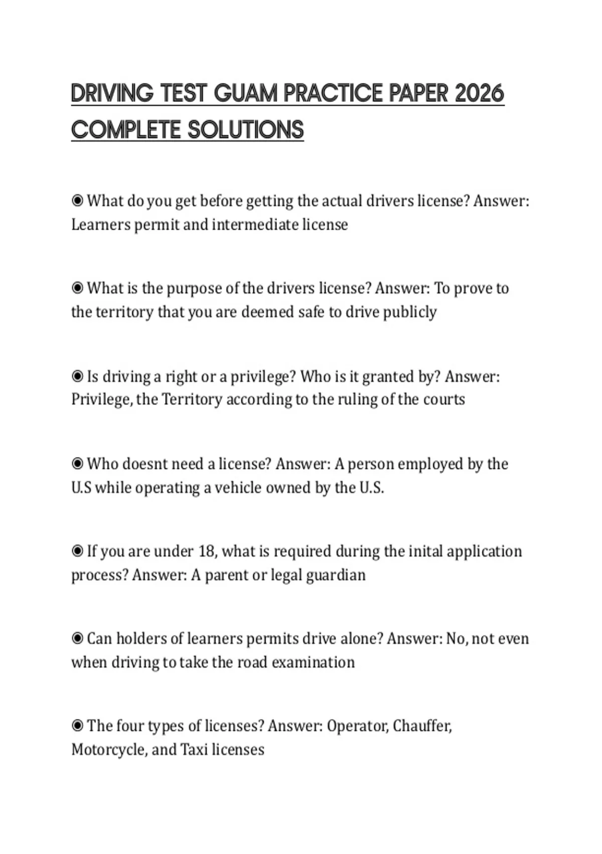 ◉ What is the purpose of the drivers license? Answer: To prove to