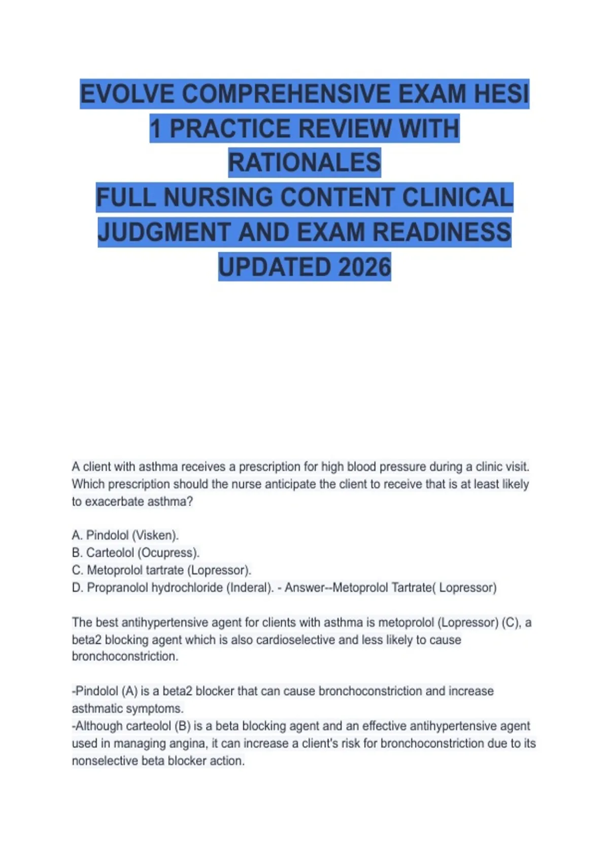 EVOLVE COMPREHENSIVE EXAM HESI 1 PRACTICE REVIEW WITH RATIONALES FULL NURSING CONTENT CLINICAL JUDGMENT AND EXAM READINESS UPDATED 2026