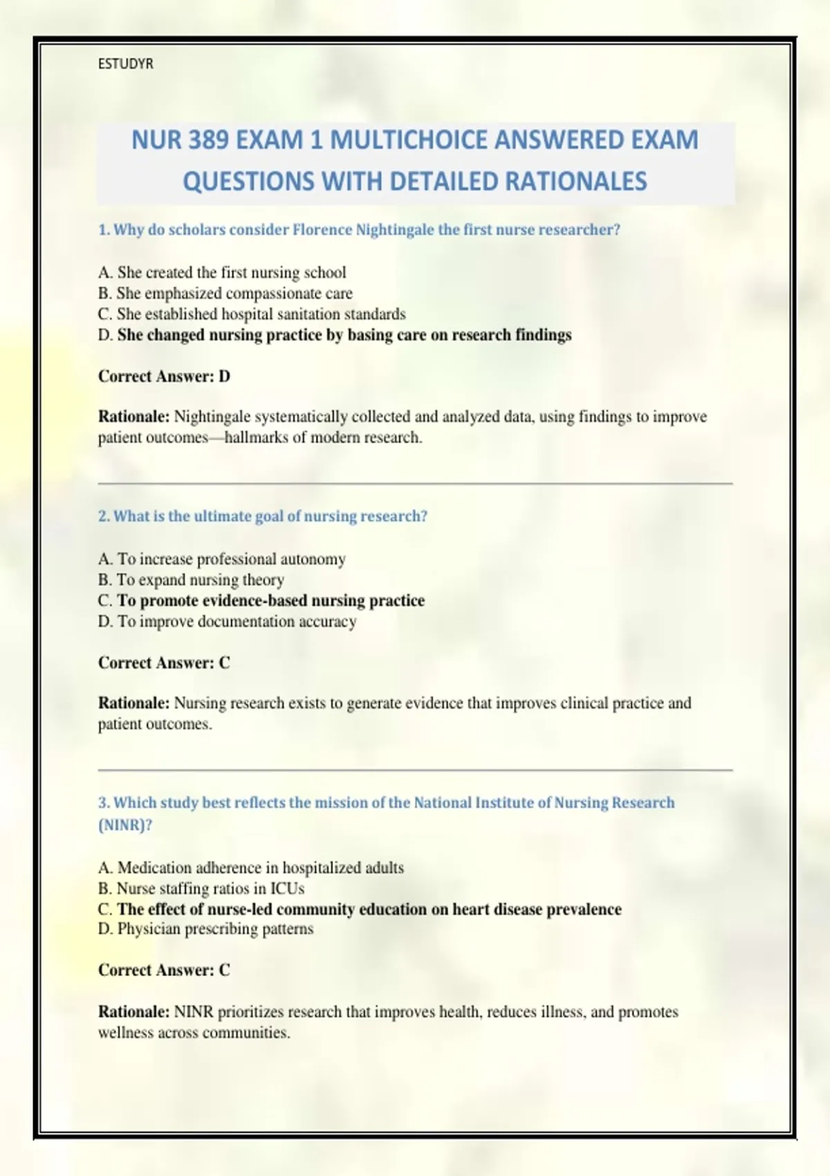 NUR 389 EXAM 1 MULTICHOICE ANSWERED EXAM