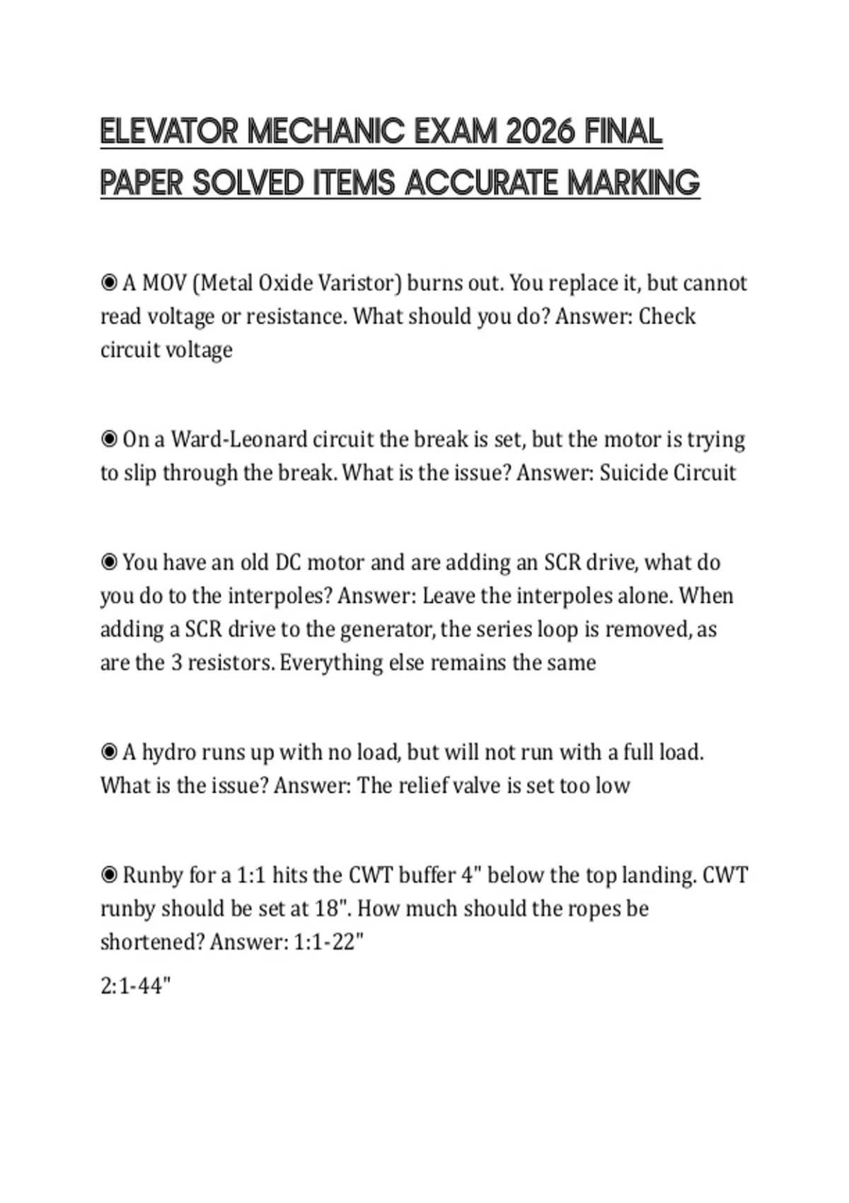 ELEVATOR MECHANIC EXAM 2026 FINAL PAPER SOLVED ITEMS ACCURATE MARKING
