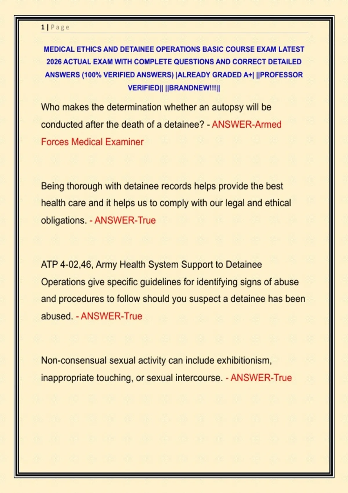 MEDICAL ETHICS AND DETAINEE OPERATIONS BASIC COURSE EXAM LATEST 2026 ACTUAL EXAM WITH COMPLETE QUESTIONS AND CORRECT DETAILED ANSWERS (100% VERIFIED ANSWERS) |ALREADY GRADED A+| ||PROFESSOR VERIFIED|| ||BRANDNEW!!!||