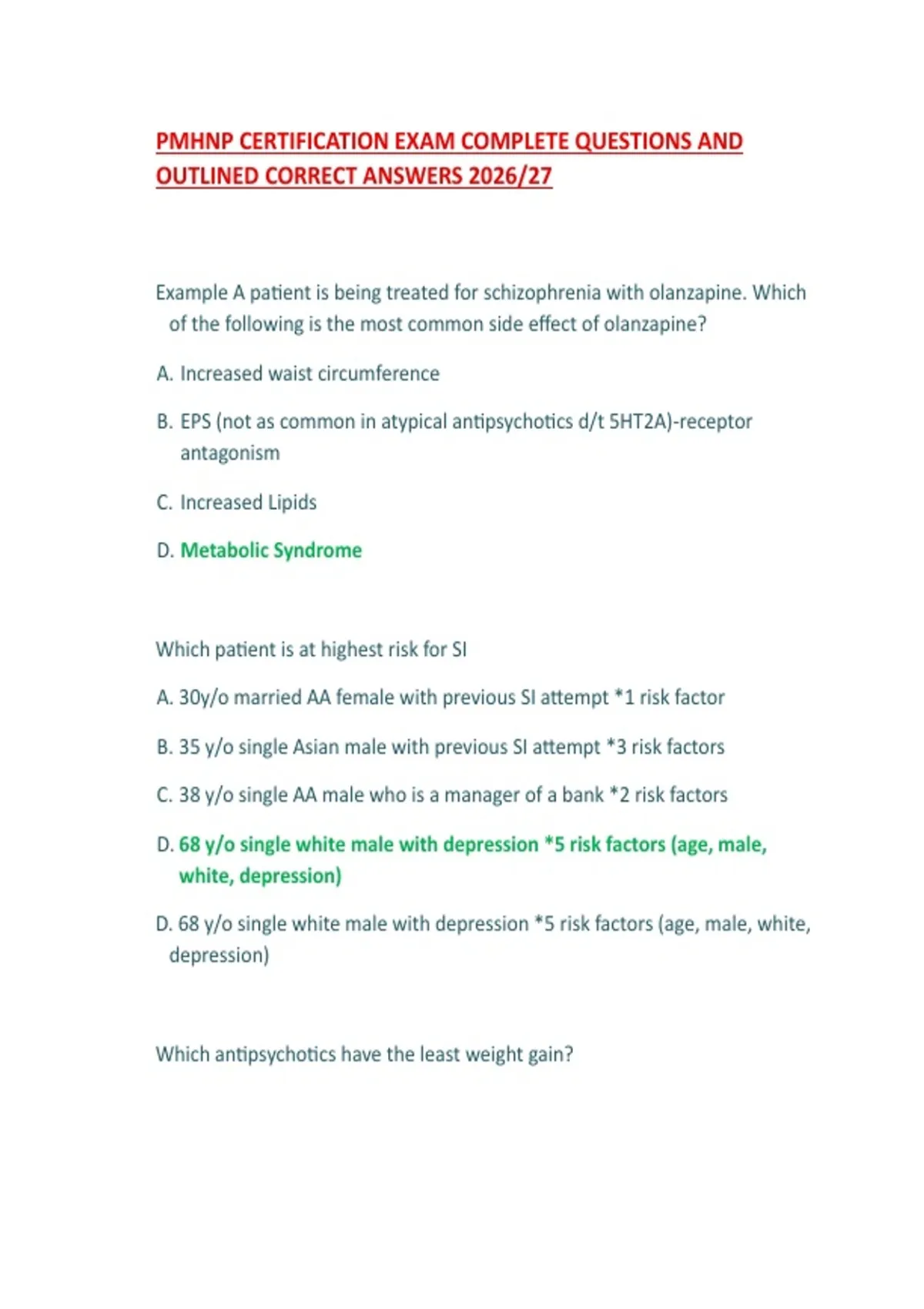 Example A patient is being treated for schizophrenia with olanzapine. Which