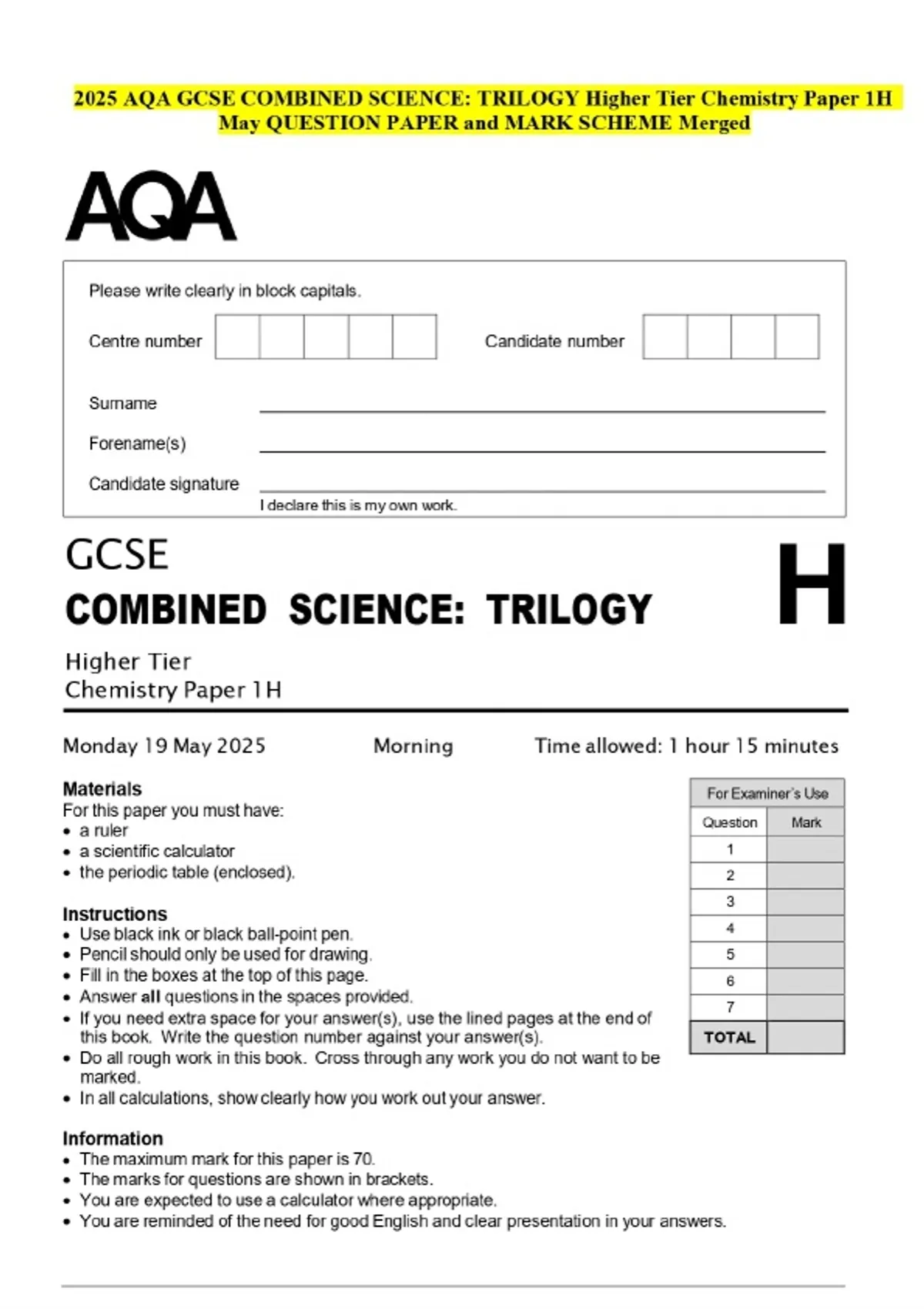 2025 AQA GCSE COMBINED SCIENCE: TRILOGY Higher Tier Chemistry Paper 1H May QUESTION PAPER and MARK SCHEME Merged