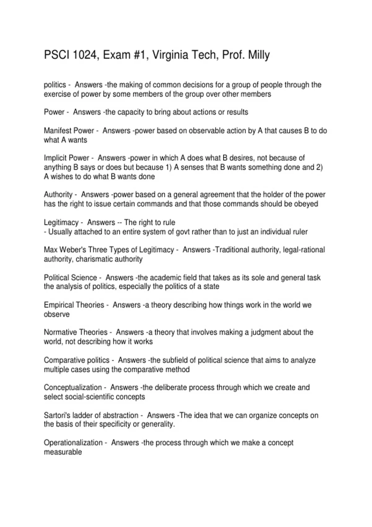 PSCI 1024, Exam #1, Virginia Tech, Prof. Milly