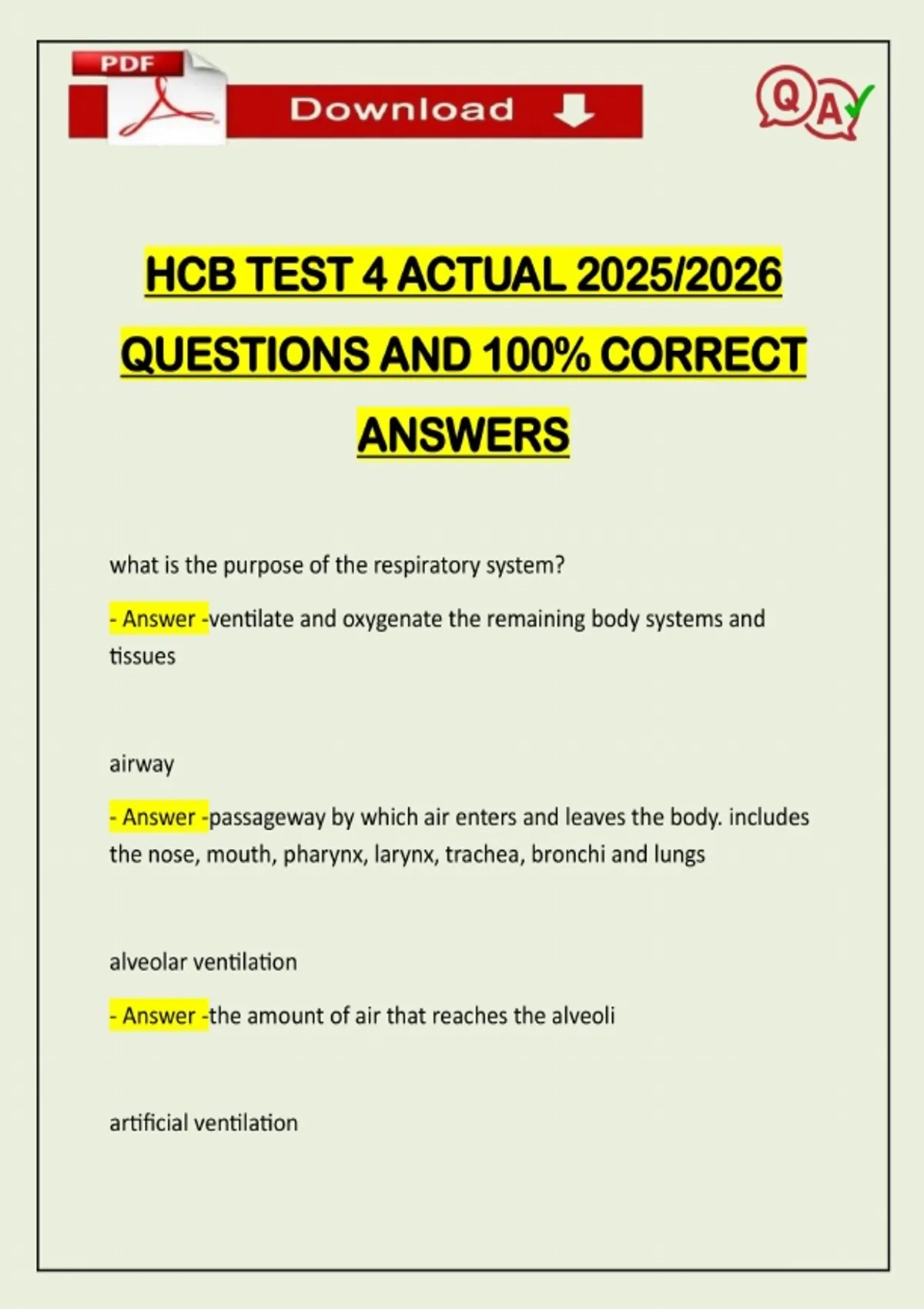 HCB TEST 4 ACTUAL 2025/2026 QUESTIONS AND 100% CORRECT ANSWERS what is the purpose of the respiratory system? - Answer -ventilate and oxygenate the remaining body systems and tissues airway - Answer -passageway by which air enters and leaves the body. includes the nose, mouth, pharynx, larynx, trachea, bronchi and lungs alveolar ventilation - Answer -the amount of air that reaches the alveoli artificial ventilation