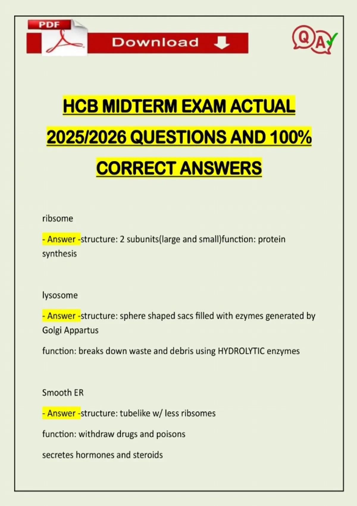 HCB MIDTERM EXAM ACTUAL 2025/2026 QUESTIONS AND 100% CORRECT ANSWERS ribsome - Answer -structure: 2 subunits(large and small)function: protein synthesis lysosome - Answer -structure: sphere shaped sacs filled with ezymes generated by Golgi Appartus function: breaks down waste and debris using HYDROLYTIC enzymes Smooth ER - Answer -structure: tubelike w/ less ribsomes function: withdraw drugs and poisons secretes hormones and steroids