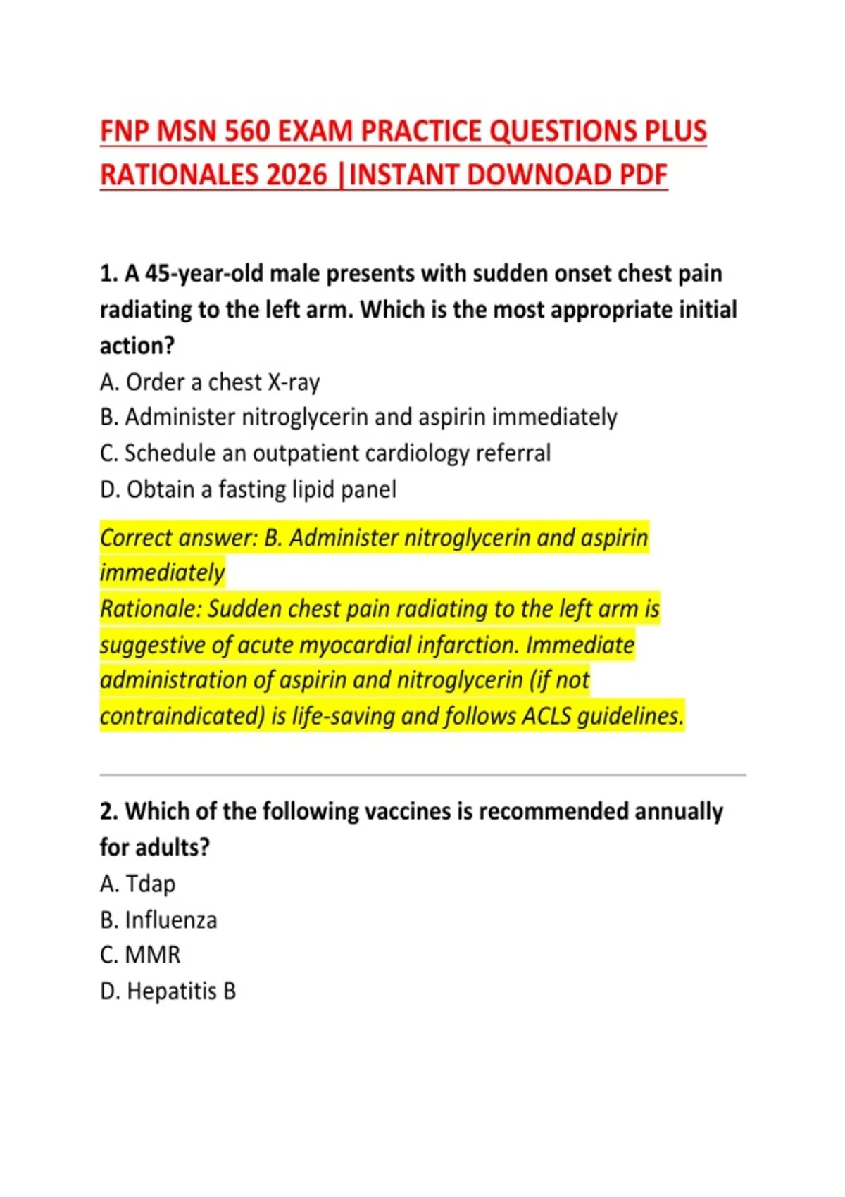 Comprehensive 2026 study resource for Family Nurse Practitioner (FNP) students enrolled in MSN 560. Includes practice questions with detailed rationales to reinforce clinical knowledge, patient assessment, diagnostic reasoning, and evidence-based practice. Ideal for exam preparation and mastery of core FNP concepts.