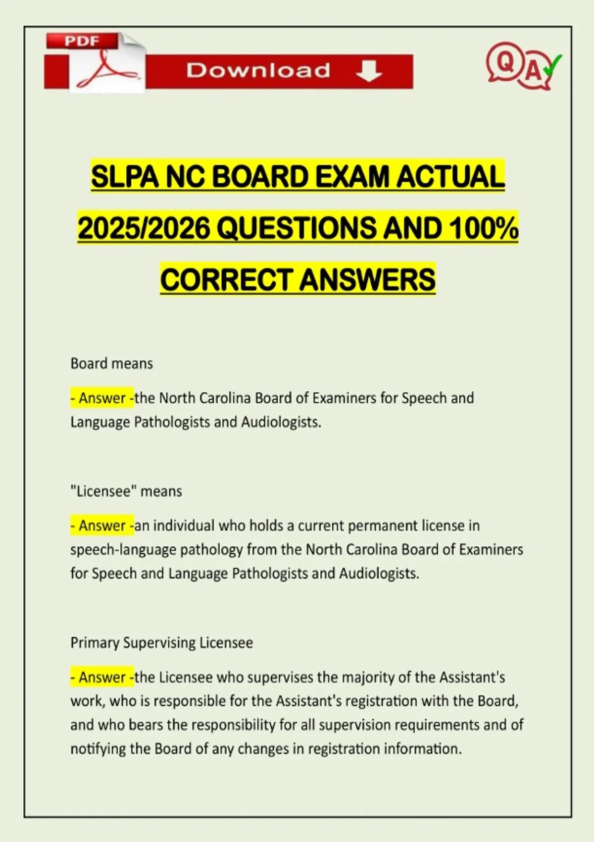 SLPA NC BOARD EXAM ACTUAL 2025/2026 QUESTIONS AND 100% CORRECT ANSWERS Board means - Answer -the North Carolina Board of Examiners for Speech and Language Pathologists and Audiologists. "Licensee" means - Answer -an individual who holds a current permanent license in speech-language pathology from the North Carolina Board of Examiners for Speech and Language Pathologists and Audiologists. Primary Supervising Licensee - Answer -the Licensee who supervises the majority of the Assistant's work, who is responsible for the Assistant's registration with the Board, and who bears the responsibility for all supervision requirements and of notifying the Board of any changes in