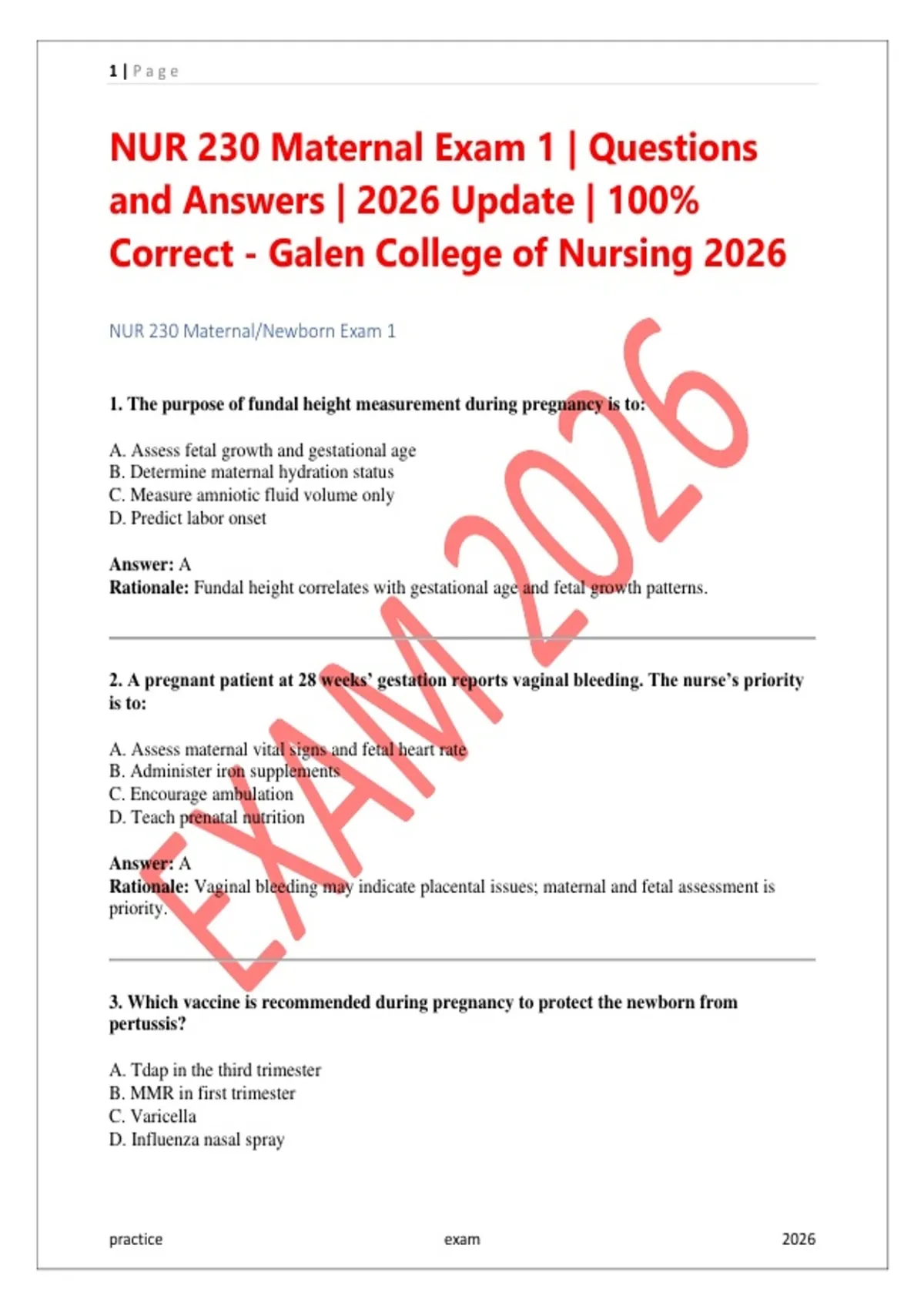 NUR 230 Maternal Exam 1 | Questions