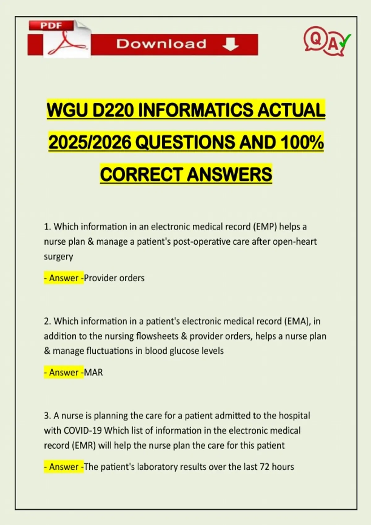 WGU D220 INFORMATICS ACTUAL 2025/2026 QUESTIONS AND 100% CORRECT ANSWERS 1. Which information in an electronic medical record (EMP) helps a nurse plan & manage a patient's post-operative care after open-heart surgery - Answer -Provider orders 2. Which information in a patient's electronic medical record (EMA), in addition to the nursing flowsheets & provider orders, helps a nurse plan & manage fluctuations in blood glucose levels - Answer -MAR