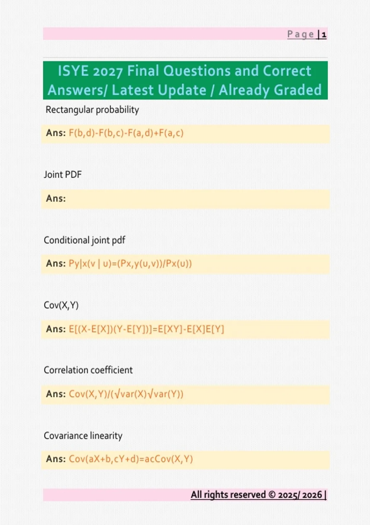 Rectangular probability Ans: F(b,d)-F(b,c)-F(a,d)+F(a,c) Joint PDF Ans: Conditional joint pdf Ans: Py|x(v | u)=(Px,y(u,v))/Px(u)) Cov(X,Y) Ans: E[(X-E[X])(Y-E[Y])]=E[XY]-E[X]E[Y] Correlation