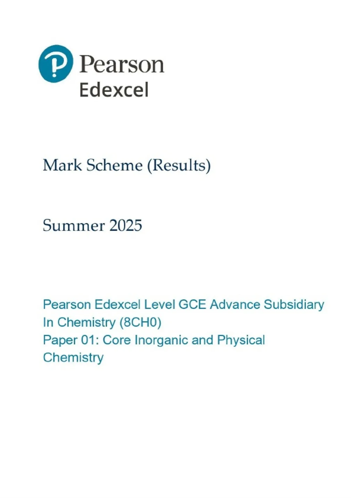 AS-LEVEL EDEXCEL 2025 CHEMISTRY PAPER 1 8CH0/01 MARK SCHEME CORE INORGANIC AND PHYSICAL CHEMISTRY