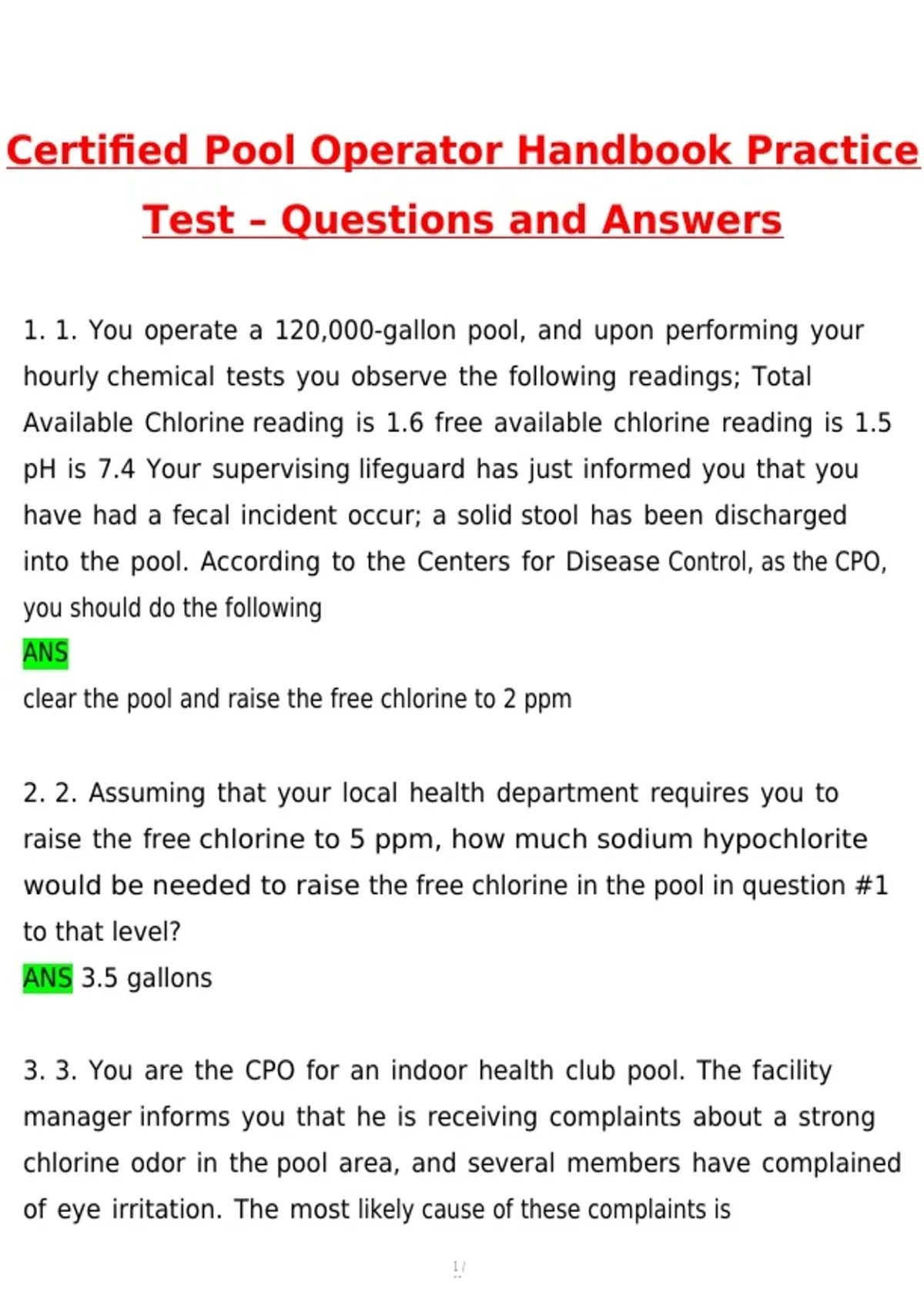Certified Pool Operator Handbook Practice