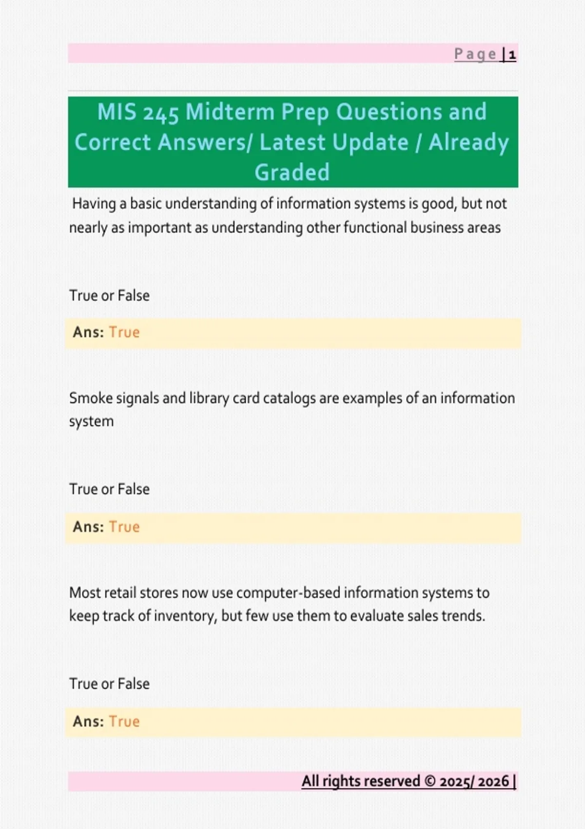 MIS 245 Midterm Prep Questions and Correct Answers/ Latest Update / Already Graded
