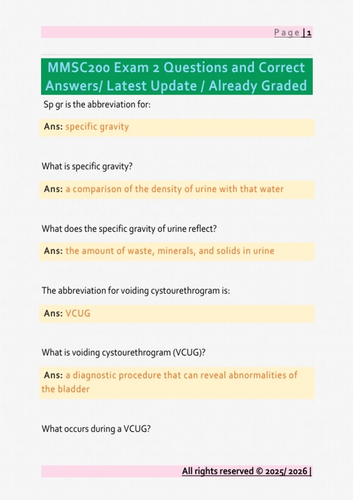 Sp gr is the abbreviation for: Ans: specific gravity What is specific gravity? Ans: a comparison of the density of urine with that water What does the specific gravity of urine reflect? Ans: the amount of waste, minerals, and solids in urine The abbreviation for voiding cystourethrogram is: Ans: VCUG What is vo