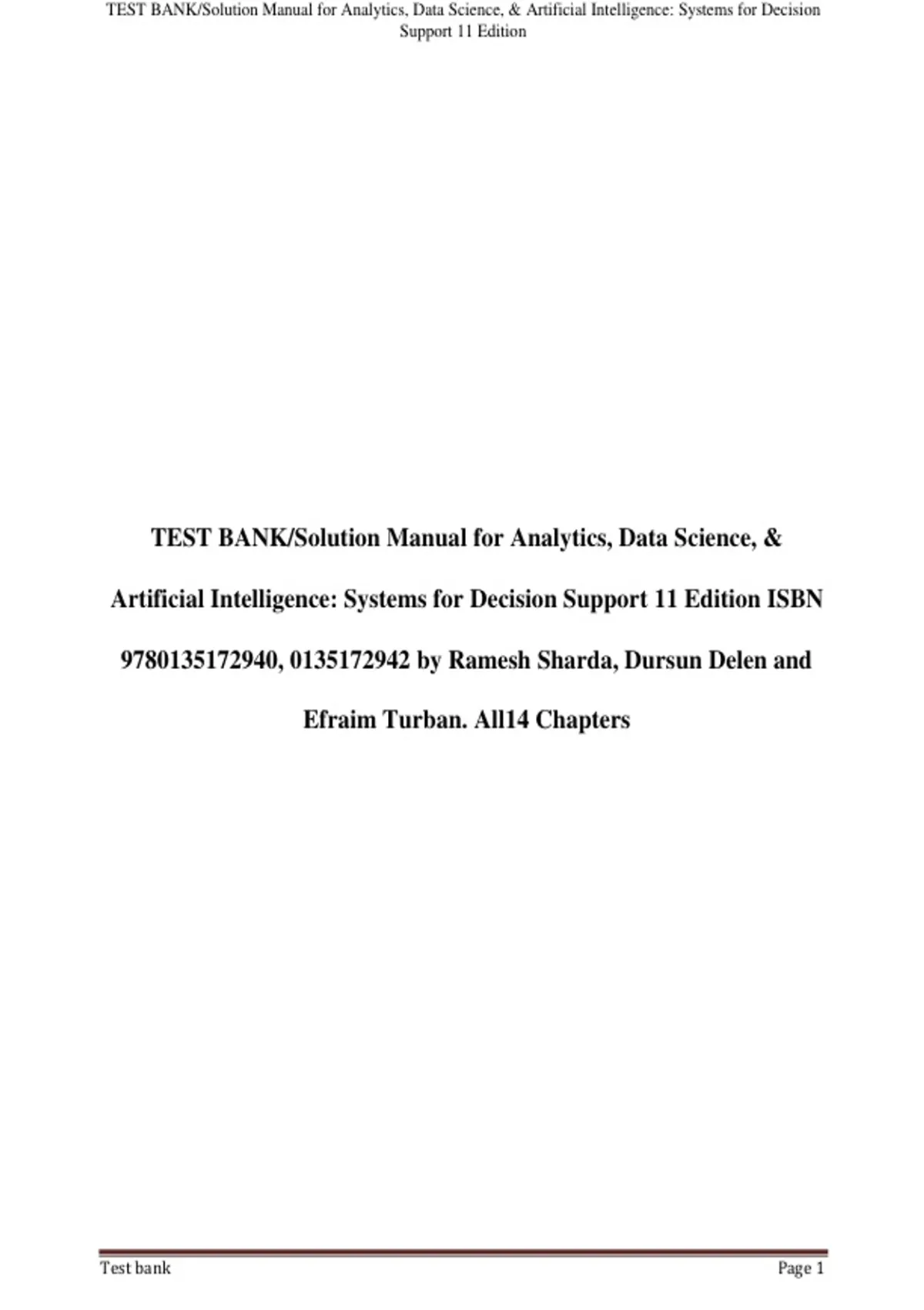 This document contains the complete test bank and solution manual for Analytics, Data Science, & Artificial Intelligence: Systems for Decision Support (11th Edition) by Ramesh Sharda, Dursun Delen, and Efraim Turban. It covers all 14 chapters, including questions, exercises, and detailed solutions aligned with the textbook content. The material is suitable for exam preparation, practice questions, and in-depth understanding of analytics, data science, and AI concepts used in decision support systems.