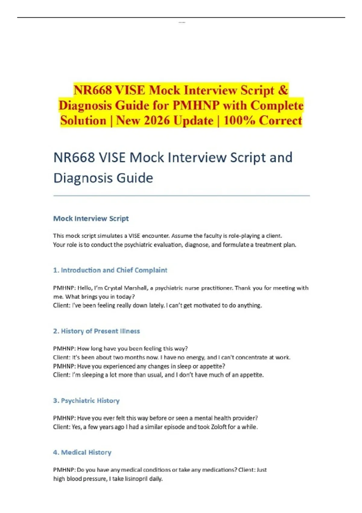 NR668 VISE Mock Interview Script & Diagnosis Guide for PMHNP with Complete Solution | New 2026 Update | 100% Correct