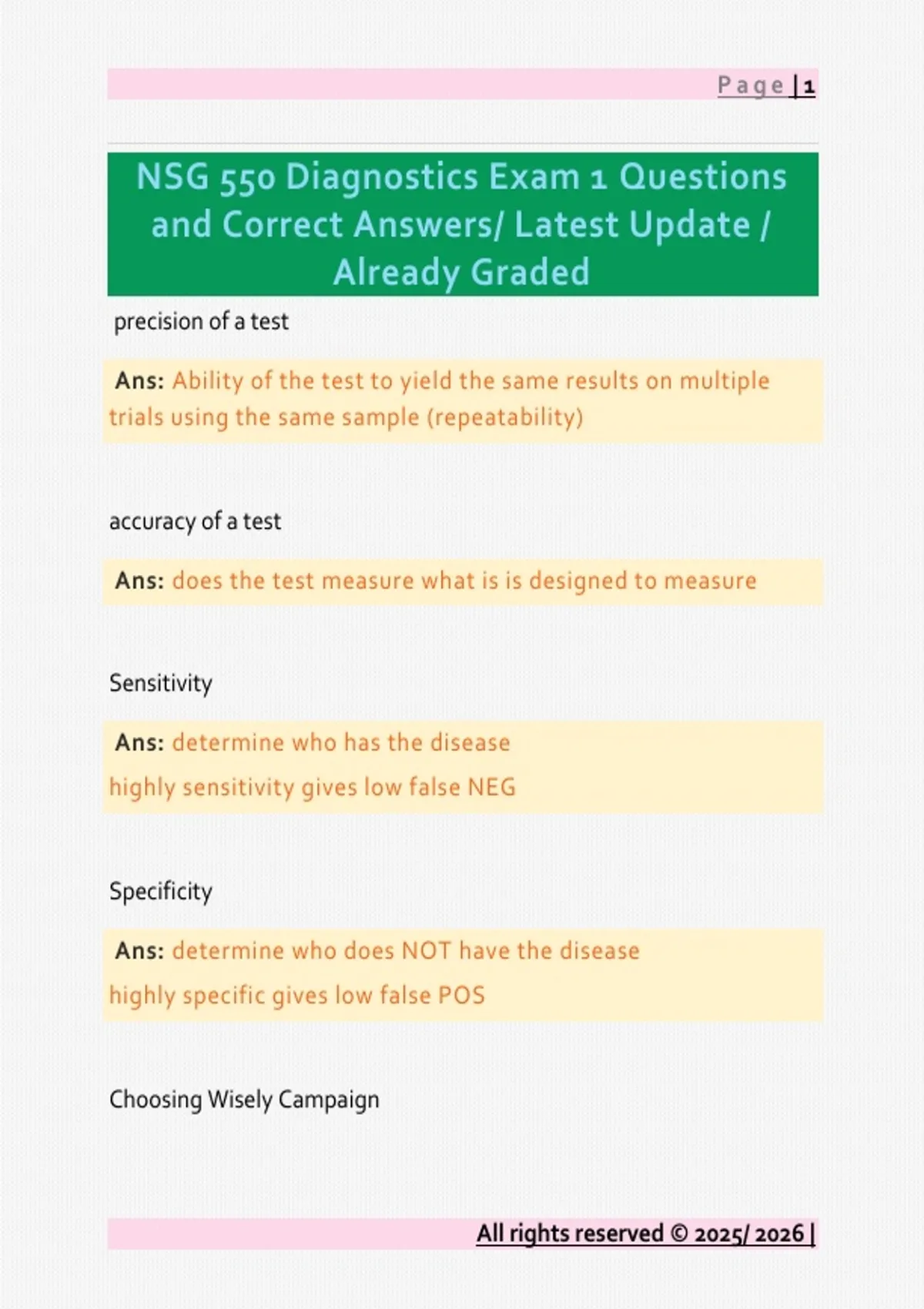 NSG 550 Diagnostics Exam 1 Questions and Correct Answers/ Latest Update / Already Graded