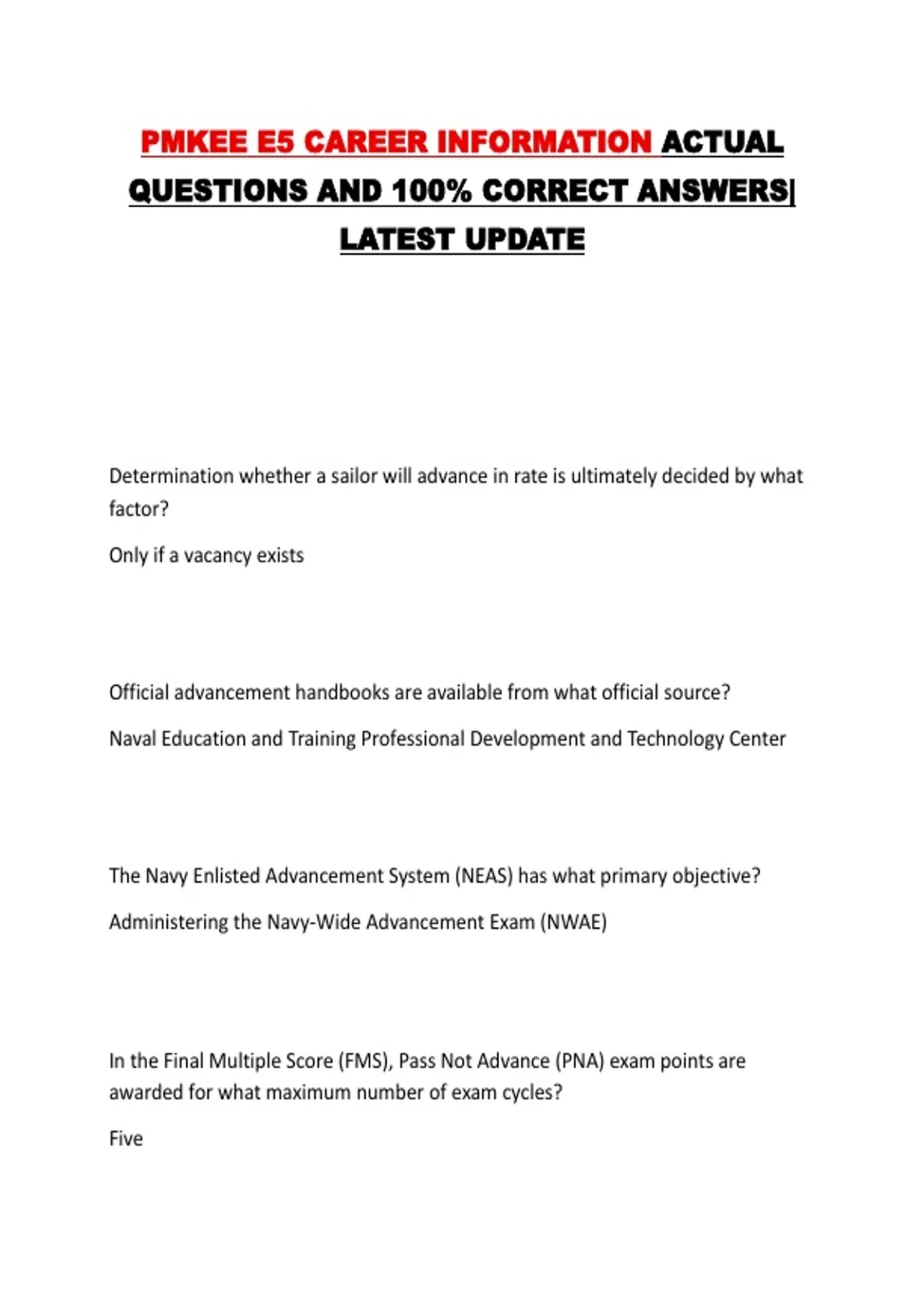 This document contains updated PMKEE E5 Career Information exam questions with verified correct answers, focusing on U.S. Navy enlisted advancement, evaluations, reenlistment, C-WAY, HYT, awards, education programs, and personnel policies. It is designed to support Sailors preparing for the E5 advancement exam by covering official instructions, forms, timelines, and career development requirements.