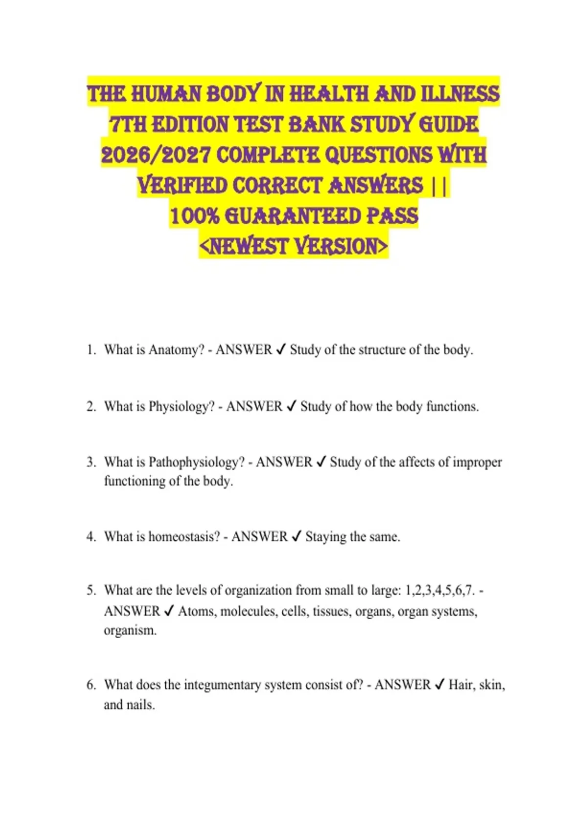 The Human Body in Health and Illness 7th Edition Test Bank STUDY GUIDE 2026/2027 COMPLETE QUESTIONS WITH VERIFIED CORRECT ANSWERS || 100% GUARANTEED PASS &lt;NEWEST VERSION&gt; 1. What is Anatomy? - ANSWER Study of the structure of the body. 2. What is Physiology? - ANSWER Study of how the body functions. 3. What is Pathophysiology? - ANSWER Study of the affects of improper functioning of the body. 4. What is homeostasis? - ANSWER Staying the same. 5. What are the levels of organization from small to large: 1,2,3,4,5,6,7. - ANSWER Atoms, molecules, cells, tissues, organs, organ systems, organism. 6. What does the integumentary system consist of? - ANSWER Hair, skin, and nails. 7. What does the skeletal system consist of? - ANSWER Bones, joints, and cartilage. 8. What are the 3 types of muscles in the muscular system? - ANSWER Skeletal, smooth, and cardiac. 9. What are the skeletal muscles responsible for? - ANSWER Skeletal muscles are responsible for movement of skeleton and maintenance of body posture. 10. What is matter? - ANSWER Matter is anything that occupies space. 11. Matter exists in 3 states: 1,2,3. - ANSWER Liquid, gas, and solid. 12. What is an element? - ANSWER An element is matter that is composed of atoms tat have the same number of positive charges in their nuclei. 13. What elements make up 96% of the body weight? - ANSWER Carbon, hydrogen, oxygen, and nitrogen. 14. What are elements composed of? - ANSWER Atoms. 15. What is an atom? - ANSWER Atom is the smallest unit of an element. 16. What is an atom composed of? - ANSWER A proton, neutron, and electron. 17. Where are the protons and neutrons located? - ANSWER In the nucleus. 18. Protons carry a _____ charge. - ANSWER Positive electric charge. 19. Neutrons carry _______ charge. - ANSWER No electrical charge. 20. Electrons carry a ______ charge. - ANSWER Negative electrical charge. 21. ______ is the simplest and smallest atom. - ANSWER Hydrogen. 22. What is a compound? - ANSWER If a molecule is built from two or more different elements. 23. What is the atomic number? - ANSWER The number of protons in the nucleus. 24. How is the atomic mass determined? - ANSWER By adding the numbers of the protons and neutrons in the nucleus. 25. Nucleus - ANSWER Control center of the cell;contains most of the DNA 26. What is the Endocrine system? - ANSWER - regulates vital processes in the body including growth, homeostasis, metabolism, and sexual development. Endocrine organs secrete hormones to regulate body processes. EX: pituitary gland, pineal gland, thymus, ovaries, testes, thyroid gland 27. What is the Circulatory system? - ANSWER - The main function of the circulatory system is to transport nutrients and gasses to cells and tissues throughout body. This is accomplished by the circulation of blood. Two components of this system are the cardiovascular and lymphatic systems. 28. What is the Cardiovascular system? - ANSWER - This system is comprised of the heart, blood, and blood vessels. The beating of the heart drives the cardiac cycle which pumps blood throughout body. 29. What is the lymphatic system? - ANSWER - This system is a vascular network of tubules and ducts that collect, filter, and return lymph to blood circulation. As a component of the immune system, the lymphatic system produces and circulates immune cells called lymphocytes. EX: lymph vessels, lymph nodes, thymus, spleen, tonsils 30. What is the Immune system? - ANSWER - A defense system that protects the body not only from pathogens, but also from allergens, such as pollens, bee venom, and some of our own cells that have gone awry (cancer cells). 31. What is the Respiratory system? - ANSWER - provides the body with oxygen via gas exchange between air from the outside environment and gases in the blood. EX: lungs, nose, trachea, bronchi 32. What is the Digestive system? - ANSWER - breaks down food polymers into smaller molecules to provide energy for the body. Digestive juices and enzymes are secreted to break down the carbohydrates, fat, and protein in food. EX: mouth, stomach, intestines, rectum
