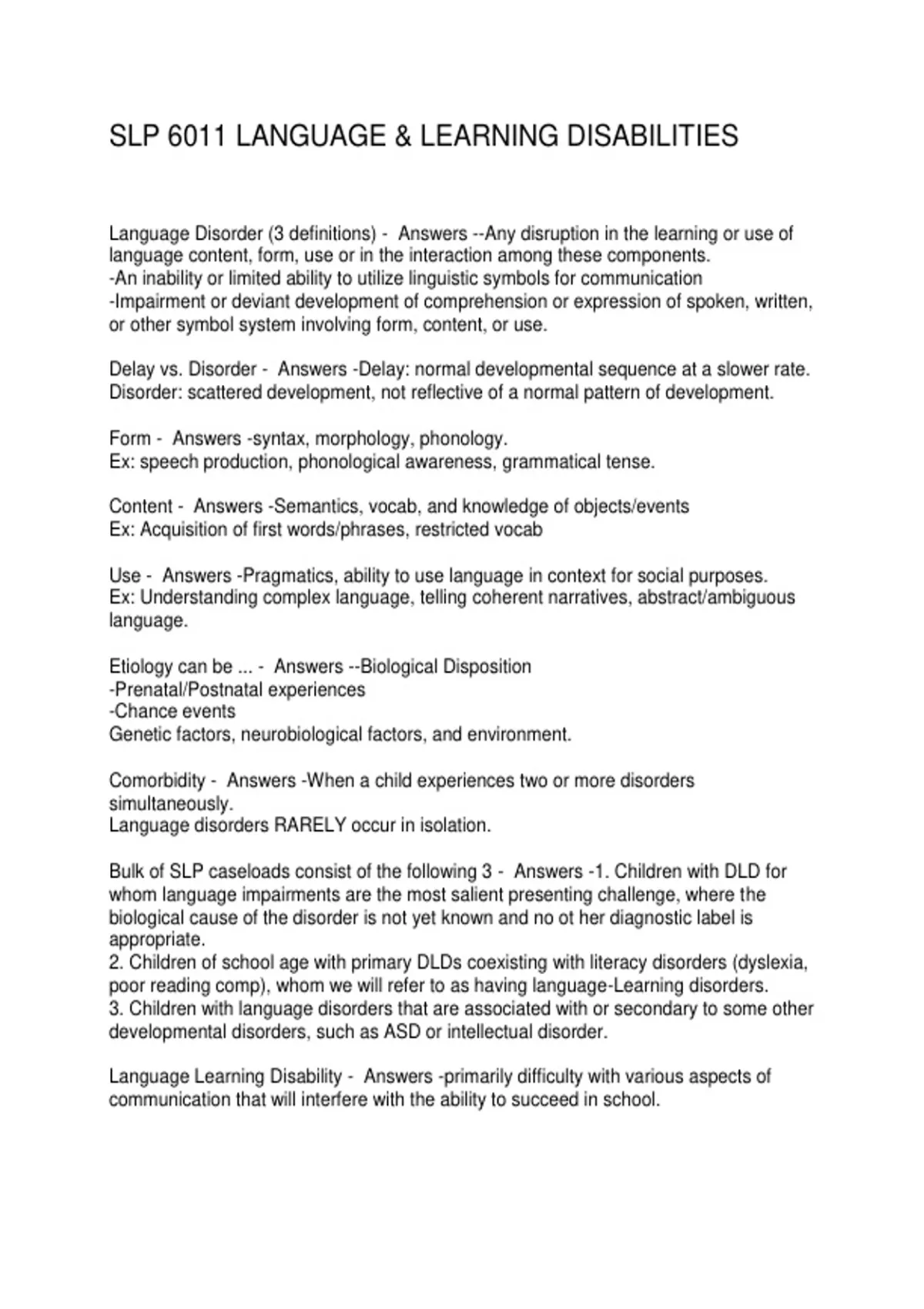 Language Disorder (3 definitions) - Answers --Any disruption in the learning or use of