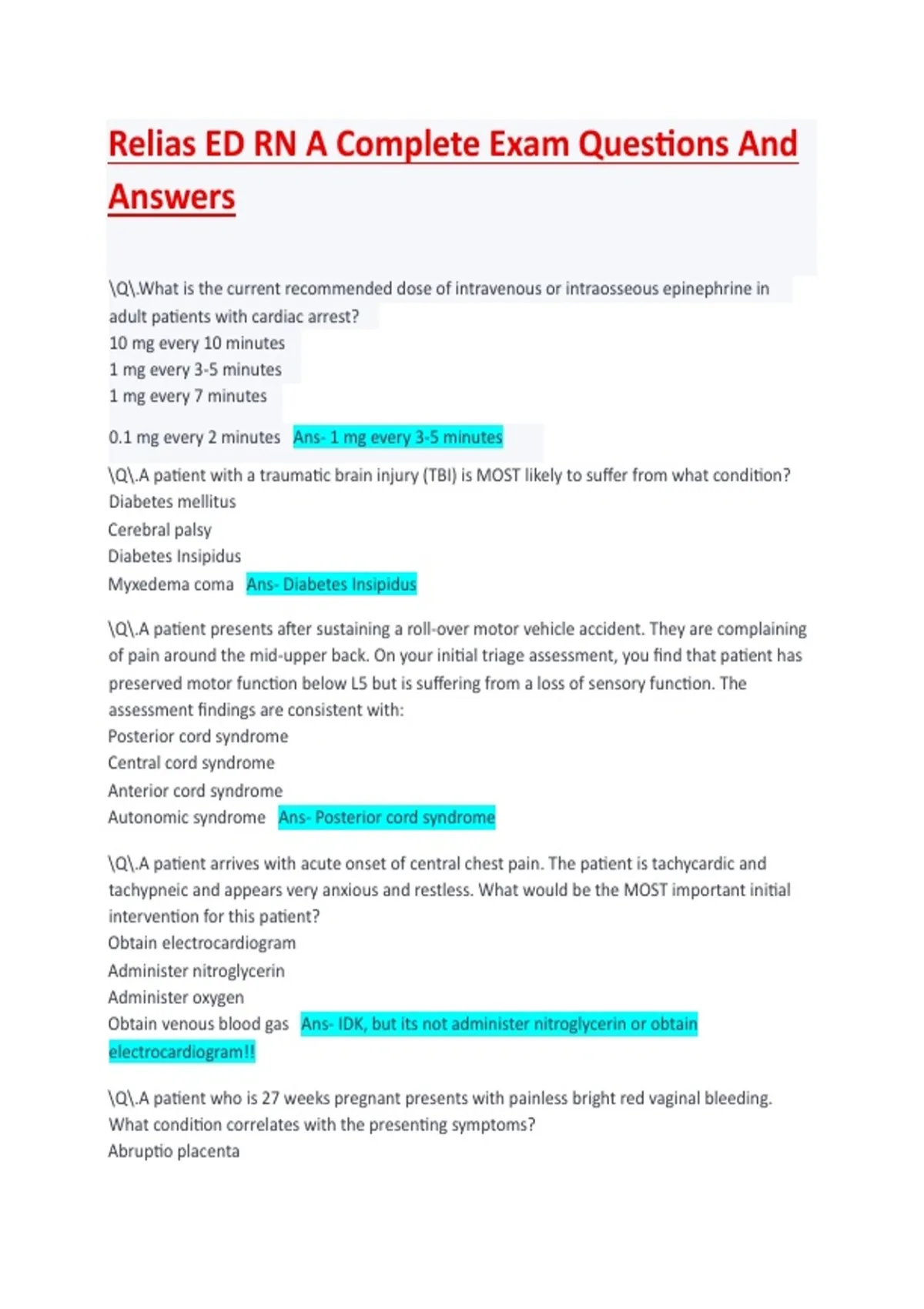 Relias ED RN A Complete Exam Questions And verified Answers Q.What is the current recommended dose of intravenous or intraosseous epinephrine in adult patients with cardiac arrest? 10 mg every 10 minutes 1 mg every 3-5 minutes 1 mg every 7 minutes 0.1 mg every 2 minutes Ans- 1 mg every 3-5 minutes Q.A patient with a traumatic brain injury (TBI) is MOST likely to suffer from what condition? Diabetes mellitus Cerebral palsy Diabetes Insipidus Myxedema coma Ans- Diabetes Insipidus Q.A patient presents after sustaining a roll-over motor vehicle accident. They are complaining of pain around the mid-upper back. On your initial triage assessment, you find that patient has preserved motor function below L5 but is suffering from a loss of sensory function. The assessment findings are consistent with: Posterior cord syndrome Central cord syndrome Anterior cord syndrome Autonomic syndrome Ans- Posterior cord syndrome Q.A patient arrives with acute onset of central chest pain. The patient is tachycardic and tachypneic and appears very anxious and restless. What would be the MOST important initial intervention for this patient? Obtain electrocardiogram Administer nitroglycerin Administer oxygen Obtain venous blood gas Ans- IDK, but its not administer nitroglycerin or obtain electrocardiogram!! Q.A patient who is 27 weeks pregnant presents with painless bright red vaginal bleeding. What condition correlates with the presenting symptoms? Abruptio placenta Placenta Previa Ectopic pregnancy Premature rupture of membranes (PROM) Ans- Placenta Previa Q.What is a common assessment finding in a patient with a tension pneumothorax? Petechial chest rash Distended neck veins Equal chest wall expansion Flattened neck veins Ans- Distended Neck Veins Q.A patient presents with a two-day history of fever, cough, mild shortness of breath (SOB), sore throat, myalgia, and new onset of loss of taste and smell. What is the patient MOST likely suffering from? Giardia Microsporidia COVID 19 Tuberculosis Ans- COVID 19 Q.The deficiency of anti-diuretic hormone (ADH) can lead to what endocrine disorders? Diabetes Insipidus Diabetes Mellitus Adrenal Insufficiency Syndrome of inappropriate secretion of ADH (SIADH) Ans- Diabetes Insipidus Q.A patient presents after an intentional overdose of propranolol approximately 2 hours ago. The patient has severe hypotension and bradycardia. IV fluids and vasopressors are initiated. What nursing assessment findings indicate the treatment has been effective? Decreasing pulse pressure Decreasing central venous pressure Increasing serum glucose Increasing serum cortisol Ans- Increasing serum glucose Q.A patient presents with acute onset of chest pain and goes into cardiac arrest immediately upon arrival. What is a possible reversible cause of cardiac arrest? Hypervolemia Alkalosis Hyperthermia Tension Pneumothorax Ans- Tension Pneumothorax Q.Which of the following represent categories utilized to triage patients during a mass casualty incident (MCI)? Green, orange, black, purple Green, blue, red, black Red, black, pink, yellow Green, yellow, red, black Ans- Green, yellow, red, black Q.A 22-year old female who is 8 weeks pregnant presents with a sudden onset of left lower abdominal pain and vaginal bleeding. The patient's family member stated that she had a syncopal episode shortly after that. What is the MOST likely diagnosis for her? Ruptured appendix Placenta previa Abruptio placenta Ruptured ectopic pregnancy Ans- Ruptured ectopic pregnancy Q.A patient with a history of chronic alcohol use is brought in with possible esophageal varices. What medication is used to stop upper gastrointestinal (GI) bleeding in patients with this condition? Octreotide (Sandostatin®) Acetaminophen (Tylenol®) Warfarin (Jantoven®) Ibuprofen (Motrin®) Ans- Octreotide (Sandostatin) Q.A patient has sustained multiple traumatic injuries after a fall from a height. What is considered an important component of the primary survey assessment? Complete set of vital signs Neurological assessment Head to toe assessment Patients allergy history Ans- Neurological Assessment Q.What do you anticipate is the BEST indicator of adequate hydration in an adult patient with 30% body surface area burn during initial fluid resuscitation? Blood pressure of 110/60 mm Hg Urine output of 0.5 mL/kg/hr Central venous pressure of 25 mm Hg