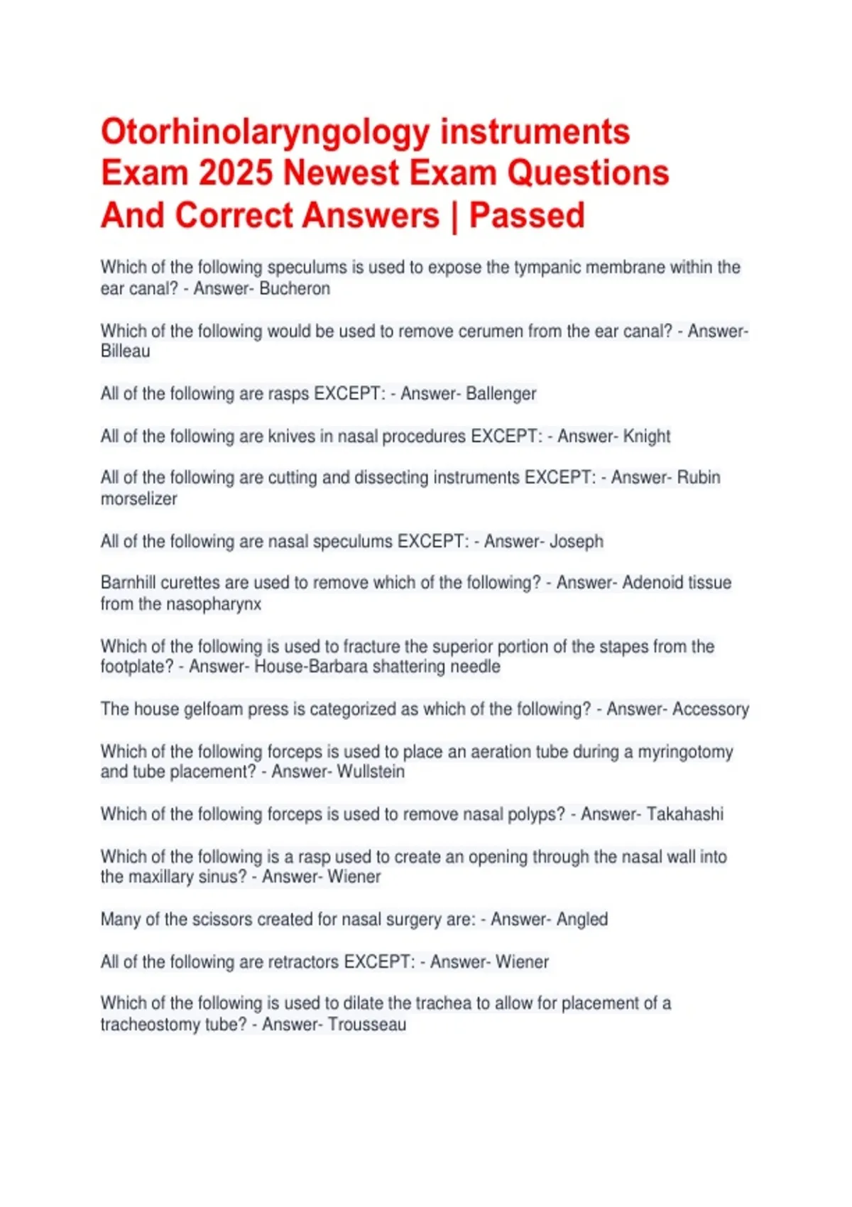 Otorhinolaryngology instruments Exam 2025 Newest Exam Questions And Correct Answers | Passed Which of the following speculums is used to expose the tympanic membrane within the ear canal? - Answer- Bucheron Which of the following would be used to remove cerumen from the ear canal? - Answer- Billeau All of the following are rasps EXCEPT: - Answer- Ballenger All of the following are knives in nasal procedures EXCEPT: - Answer- Knight All of the following are cutting and dissecting instruments EXCEPT: - Answer- Rubin morselizer All of the following are nasal speculums EXCEPT: - Answer- Joseph Barnhill curettes are used to remove which of the following? - Answer- Adenoid tissue from the nasopharynx Which of the following is used to fracture the superior portion of the stapes from the footplate? - Answer- House-Barbara shattering needle The house gelfoam press is categorized as which of the following? - Answer- Accessory Which of the following forceps is used to place an aeration tube during a myringotomy and tube placement? - Answer- Wullstein Which of the following forceps is used to remove nasal polyps? - Answer- Takahashi Which of the following is a rasp used to create an opening through the nasal wall into the maxillary sinus? - Answer- Wiener Many of the scissors created for nasal surgery are: - Answer- Angled All of the following are retractors EXCEPT: - Answer- Wiener Which of the following is used to dilate the trachea to allow for placement of a tracheostomy tube? - Answer- Trousseau Which of the following forceps is used to cut or bend the wire on the prosthesis during an ossicular reconstruction? - Answer- McGee Which of the following curettes is used to remove polyps and diseased sinus tissue? - Answer- Coakley Which of the following is a self-retaining mouth retractor? - Answer- Jennings