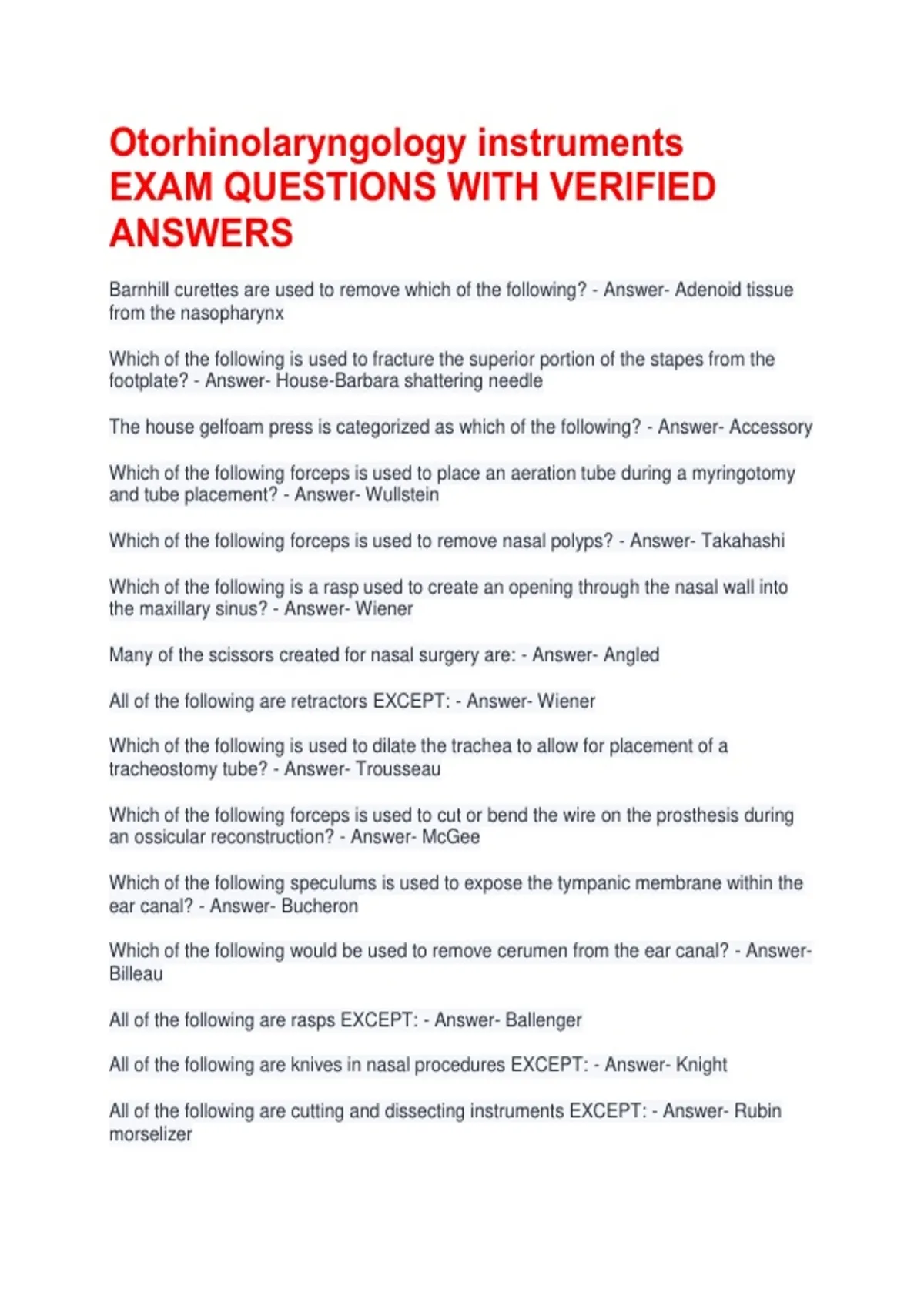 Otorhinolaryngology instruments EXAM QUESTIONS WITH VERIFIED ANSWERS