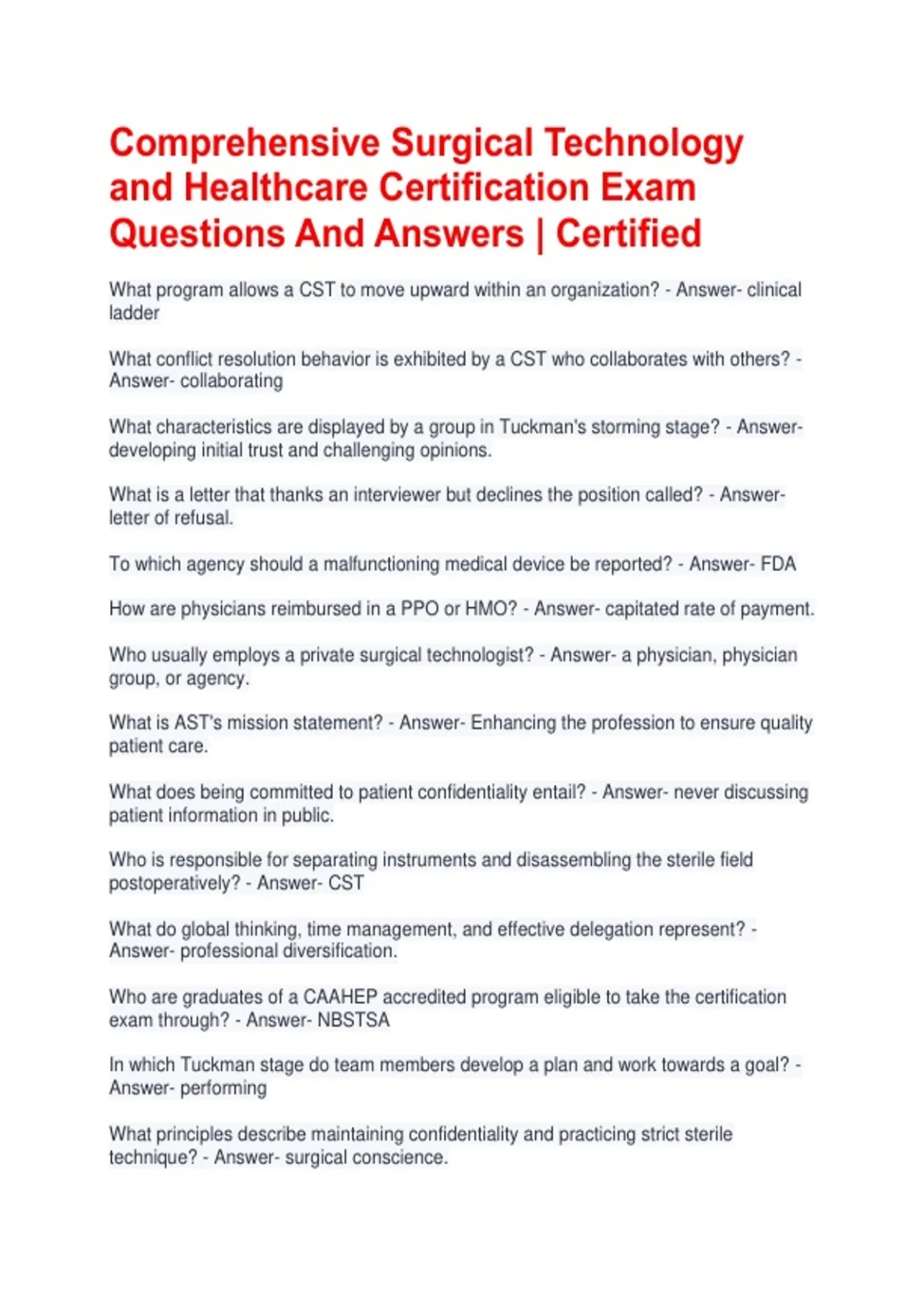 Comprehensive Surgical Technology and Healthcare Certification Exam Questions And Answers | Certified What program allows a CST to move upward within an organization? - Answer- clinical ladder What conflict resolution behavior is exhibited by a CST who collaborates with others? - Answer- collaborating What characteristics are displayed by a group in Tuckman's storming stage? - Answer- developing initial trust and challenging opinions. What is a letter that thanks an interviewer but declines the position called? - Answer- letter of refusal. To which agency should a malfunctioning medical device be reported? - Answer- FDA How are physicians reimbursed in a PPO or HMO? - Answer- capitated rate of payment. Who usually employs a private surgical technologist? - Answer- a physician, physician group, or agency. What is AST's mission statement? - Answer- Enhancing the profession to ensure quality patient care. What does being committed to patient confidentiality entail? - Answer- never discussing patient information in public. Who is responsible for separating instruments and disassembling the sterile field postoperatively? - Answer- CST What do global thinking, time management, and effective delegation represent? - Answer- professional diversification. Who are graduates of a CAAHEP accredited program eligible to take the certification exam through? - Answer- NBSTSA In which Tuckman stage do team members develop a plan and work towards a goal? - Answer- performing What principles describe maintaining confidentiality and practicing strict sterile technique? - Answer- surgical conscience. Which component of communication can be distorted by outside noise? - Answer- message Which component of communication is affected by outside noise? - Answer- receiver When does professionalism for the surgical technologist begin? - Answer- with competency in the workplace. How many phases does surgical case management consist of? - Answer- three Under whose direction do surgical technologists usually work? - Answer- director of nursing Does the ARC/STSA administer the national certification examination for surgical technologists? - Answer- False What is the primary role of the risk management department? - Answer- to establish policies for patient and employee safety. What terms are applied to entry-level, proficient, and expert practitioners? - Answer- AST recommended clinical ladder. Which insurance provider reimburses physicians and hospitals for qualified patients? - Answer- Medicare What describes provider reimbursement based on average charges? - Answer- DRG Which department controls the physical environment and performs safety checks? - Answer- biomedical engineering Which department tracks higher-than-normal post-operative infection rates? - Answer- infection control Which department provides pre-, intra-, and postoperative pathological studies? - Answer- pathology What nonverbal body language might be perceived as a negative attitude? - Answer- tightly folded arms Which federal agency enforces workplace safety standards? - Answer- OSHA What fundamental aspect of surgery promotes positive team interactions? - Answer- teamwork Who developed the first X-ray machine? - Answer- Roentgen