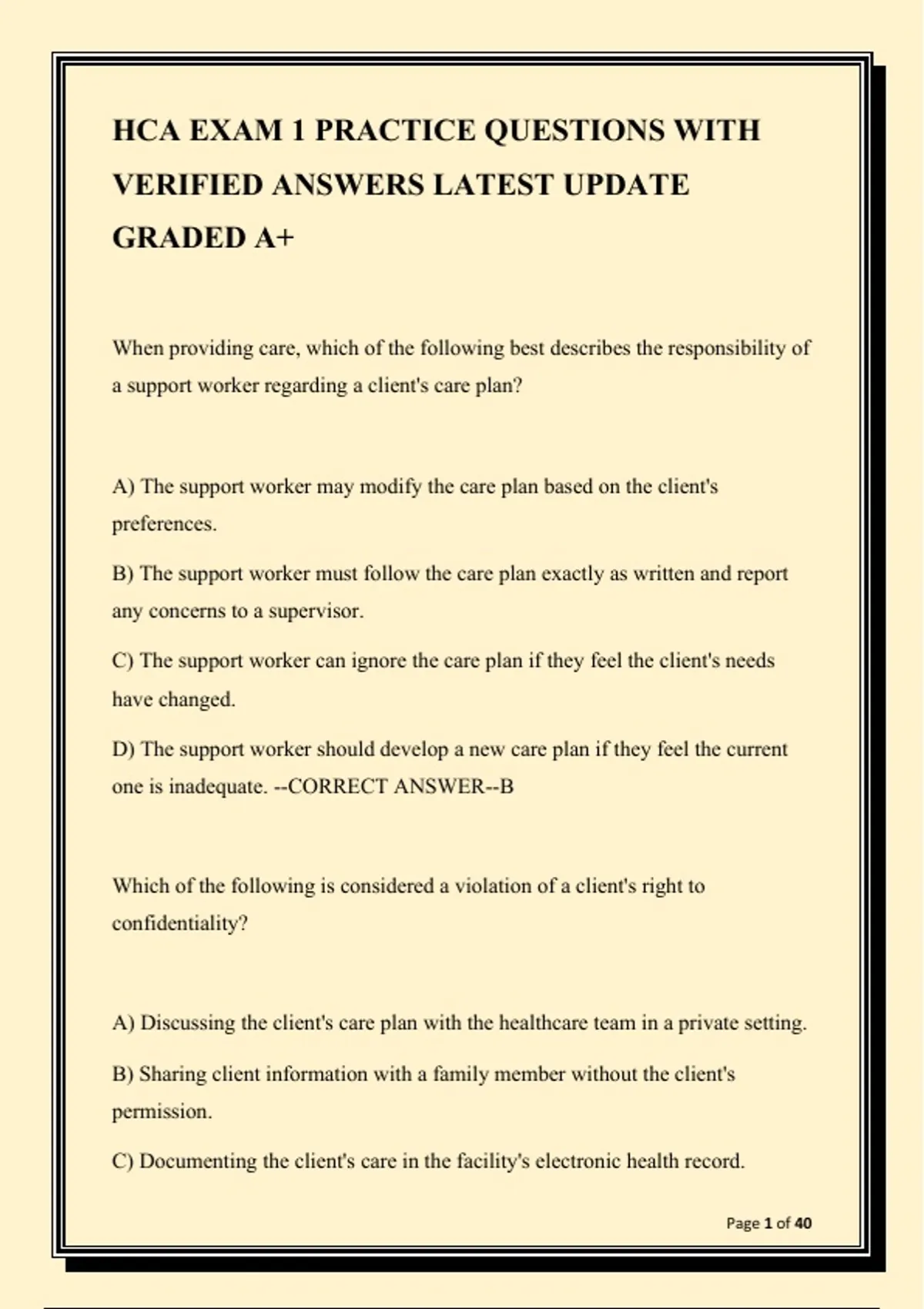 Prepare confidently for your Health Care Aide (HCA) Exam 1 with this comprehensive set of practice questions and verified answers. This study guide covers essential topics: scope of practice, client confidentiality, communication techniques, care planning, Canadian healthcare principles (Canada Health Act), ethics, infection control, and more. Perfect for self-assessment and exam review.
