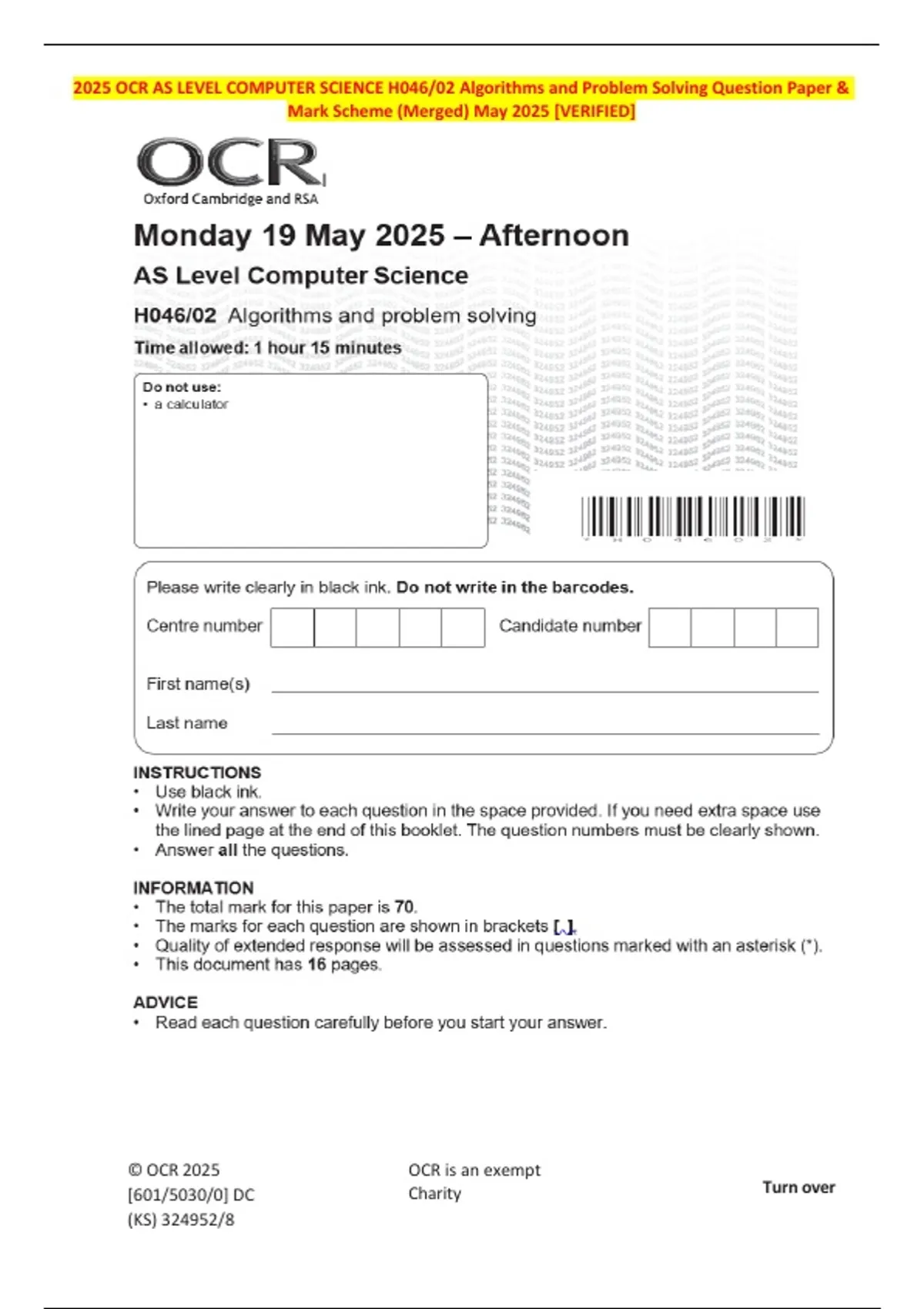 2025 OCR AS LEVEL COMPUTER SCIENCE H046/02 Algorithms and Problem Solving Question Paper & Mark Scheme (Merged) May 2025 [VERIFIED]