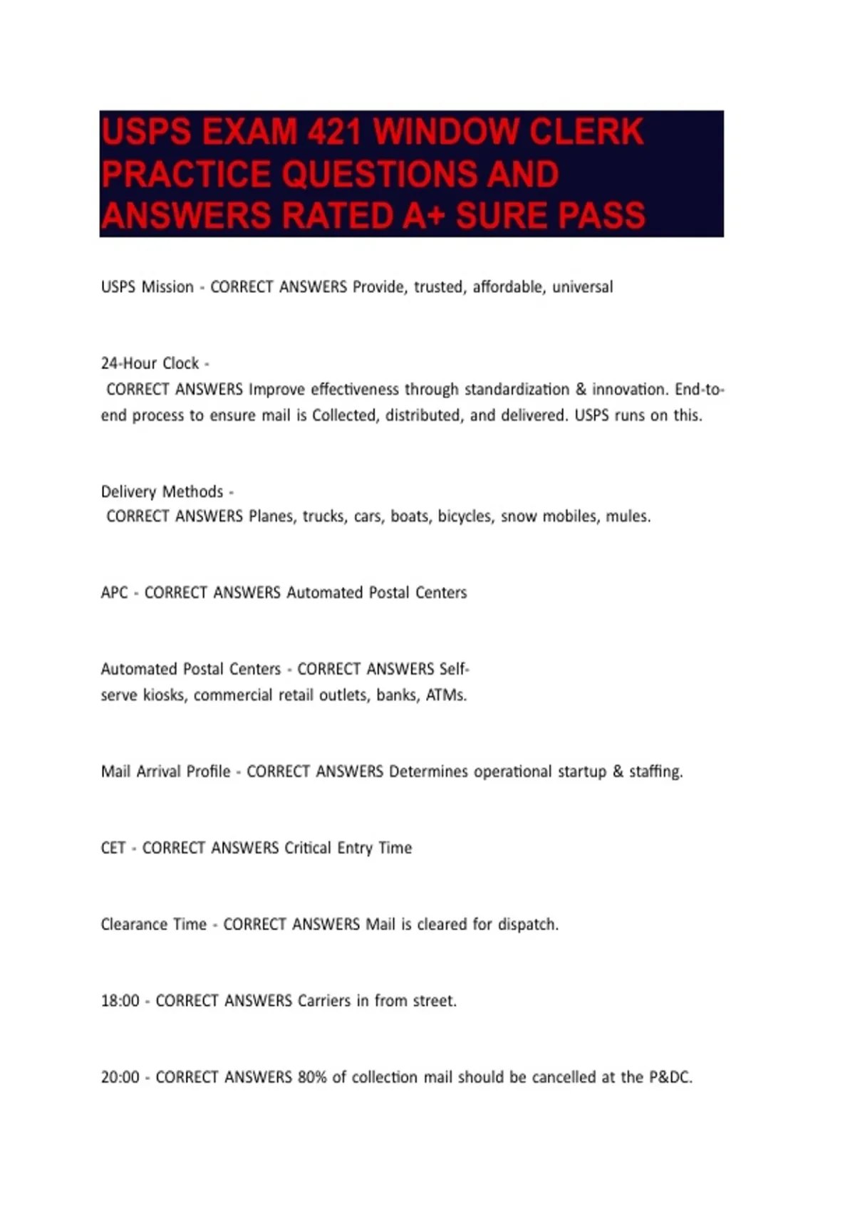 USPS EXAM 421 WINDOW CLERK PRACTICE QUESTIONS AND ANSWERS RATED A+ SURE PASS