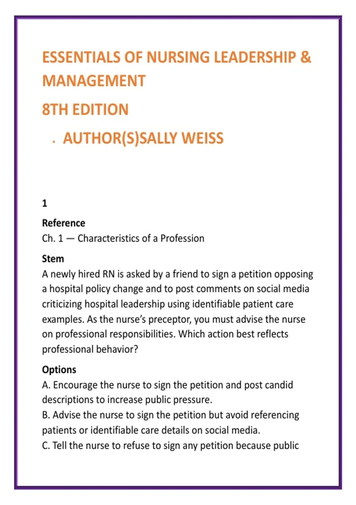 Essentials of Nursing Leadership & Management 8th Edition Test Bank | Weiss | Delegation, Prioritization & Leadership MCQs 2) SEO Product Description (200–300 words) Prepare with confidence for nursing leadership, management, and professional practice exams using this comprehensive digital test bank for Essentials of Nursing Leadership & Management, 8th Edition by Sally Weiss. Designed specifically for undergraduate nursing students, this resource delivers full textbook coverage with leadership-focused, NCLEX-style multiple-choice questions that develop real-world decision-making skills. Each chapter includes 20 scenario-based MCQs written at application, analysis, and evaluation levels, mirroring the complexity of leadership challenges faced by staff nurses, charge nurses, and novice nurse managers. Questions emphasize delegation, prioritization, communication, conflict resolution, ethical and legal accountability, quality improvement, and healthcare systems thinking, ensuring relevance beyond rote memorization. This test bank is ideal for students who want time-efficient study, targeted leadership preparation, and clear rationales that explain not just what is correct—but why. Rationales reinforce professional judgment, patient safety, and systems-based leadership principles aligned with Weiss’s widely adopted core text. What’s Included Full-chapter coverage of Essentials of Nursing Leadership & Management (8th Edition) 20 high-quality MCQs per chapter Verified correct answers with clear, evidence-based rationales Leadership and management scenarios reflecting real clinical practice Focus on delegation, prioritization, supervision, ethics, quality, and safety Ideal For Nursing Leadership & Management courses Professional Nursing Practice coursework Nursing Administration classes Capstone and final-semester nursing students Transition-to-Practice and Preceptorship programs This test bank supports exam success, leadership readiness, and confident clinical judgment—making it an essential companion to one of the most trusted leadership texts in nursing education. 3) 8 High-Value SEO Keywords nursing leadership and management test bank Essentials of Nursing Leadership Weiss nursing management study guide delegation and prioritization MCQs nurse leadership exam questions nursing leadership NCLEX style questions nursing administration test bank professional nursing practice MCQs 4) 10 Hashtags #NursingLeadership #NursingManagement #NurseManagerPrep #DelegationAndPrioritization #NursingExamPrep #LeadershipInNursing #NursingTestBank #ProfessionalNursingPractice #ChargeNursePreparation #NursingStudents
