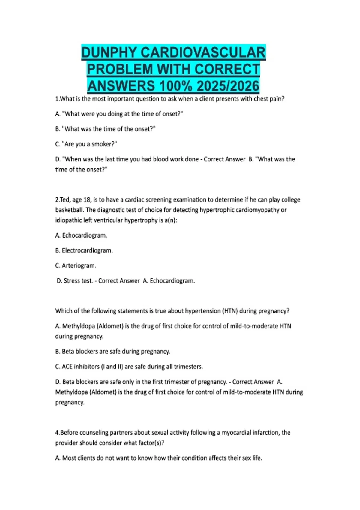 DUNPHY CARDIOVASCULAR PROBLEM WITH CORRECT ANSWERS 100% 2025/2026 1.What is the most important question to ask when a client presents with chest pain? A. "What were you doing at the time of onset?" B. "What was the time of the onset?" C. "Are you a smoker?" D. "When was the last time you had blood work done - Correct Answer B. "What was the time of the onset?" 2.Ted, age 18, is to have a cardiac screening examination to determine if he can play college basketball. The diagnostic test of choice for detecting hypertrophic cardiomyopathy or idiopathic left ventricular hypertrophy is a(n): A. Echocardiogram. B. Electrocardiogram. C. Arteriogram. D. Stress test. - Correct Answer A. Echocardiogram. Which of the following statements is true about hypertension (HTN) during pregnancy? A. Methyldopa (Aldomet) is the drug of first choice for control of mild-to-moderate HTN during pregnancy. B. Beta blockers are safe during pregnancy. C. ACE inhibitors (I and II) are safe during all trimesters. D. Beta blockers are safe only in the first trimester of pregnancy. - Correct Answer A. Methyldopa (Aldomet) is the drug of first choice for control of mild-to-moderate HTN during pregnancy. 4.Before counseling partners about sexual activity following a myocardial infarction, the provider should consider what factor(s)? A. Most clients do not want